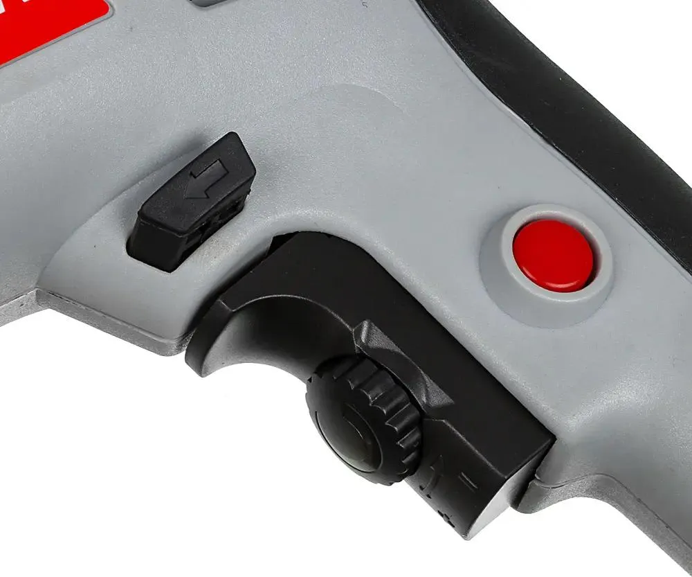 Рукоятка имеет мягкую накладку и упор в нижней части для надежного захвата дрели во время работы. Ударный механизм облегчает сверление бетона и кирпичной кладки.