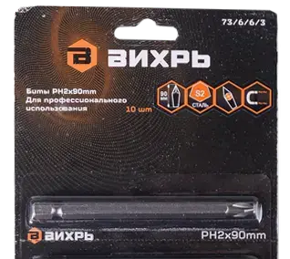 Биты Вихрь PH2 90 мм (73/6/6/3) - предназначены для использования в качестве насадок в шуруповёртах, аккумуляторных отвёртках, ручных и реверсивных отвёртках со сменными насадками.
