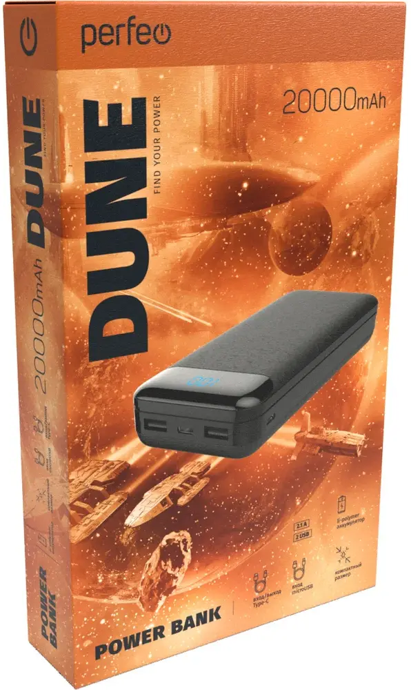Powerbank Perfeo «Dune» - незаменимый помощник, когда нет доступа к источнику питания. Благодаря двум USB-выходам и выходу Type-C вы сможете заряжать три устройства одновременно. LED экран всегда подскажет сколько энергии осталось во внешнем аккумуляторе.
