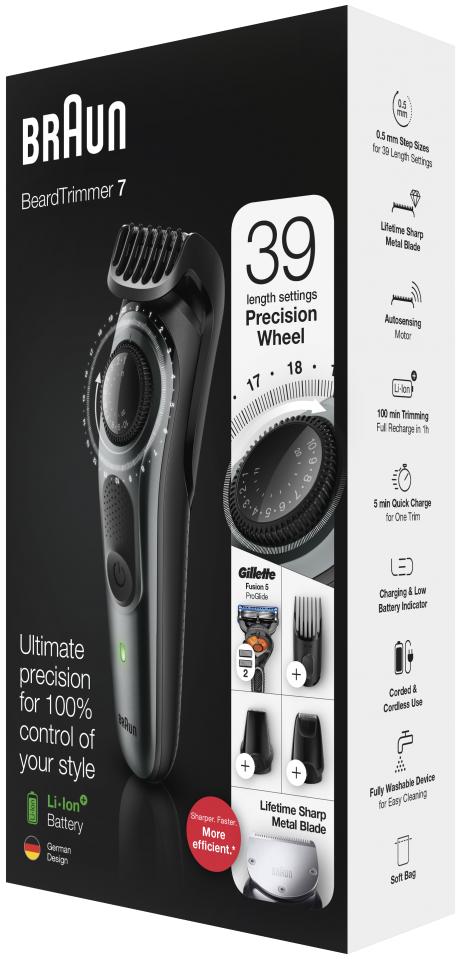 Создай свой стиль без лишних усилий с триммером для бороды Braun BT7220 для мужчин. Прибор BT7220 оснащен высокоточной шкалой с 39 настройками длины, острыми металлическими лезвиями с неограниченным сроком службы и литий-ионным аккумулятором, который позволит работать триммеру до 100 минут. Полная зарядка за 1 час, а также функция "быстрая подзарядка" на 1 стрижку, которая занимает 5 мин. Головку триммера и гребень можно промывать водой.