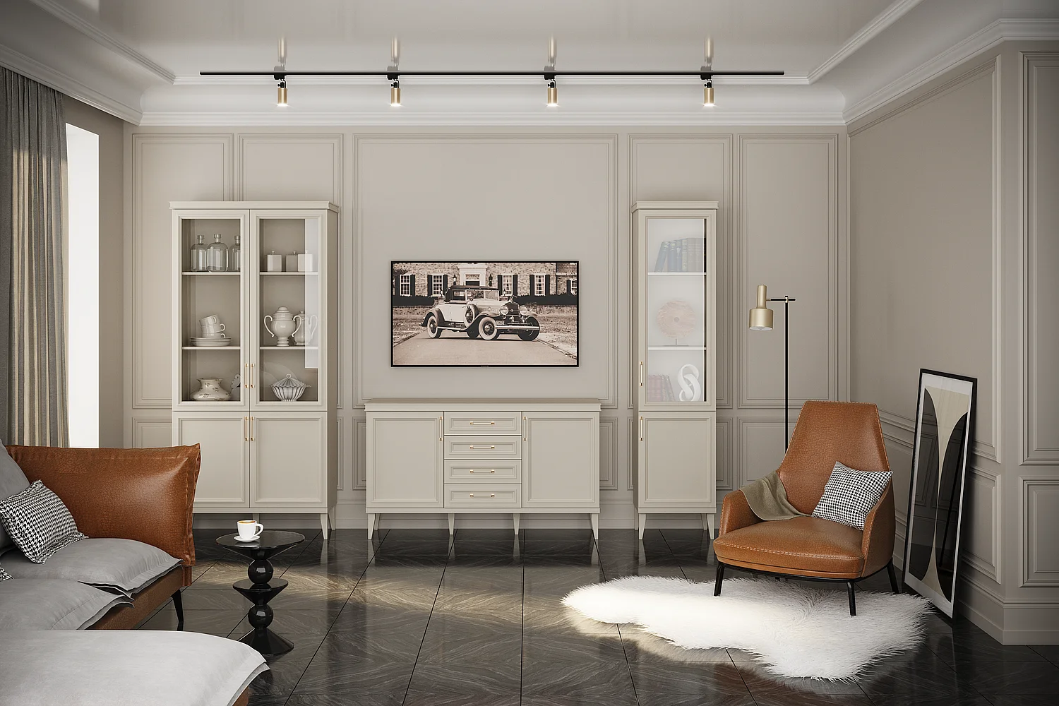 - Фасады: рамочной конструкции из профиля МДФ, окутанного бумагой с «финиш-эффектом». В «глухих» фасадах — вставки из ЛМДФ 0,6 см, в фасадах со стеклом — вставки из стекла 0,4 см;