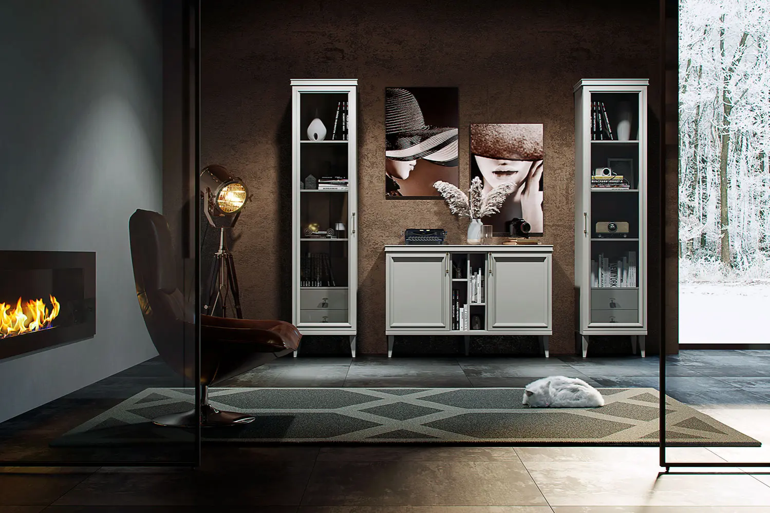 - Комод с тремя секциями: средняя секция — с двумя полками, за распашными фасадами — по одной съемной щитовой полке;