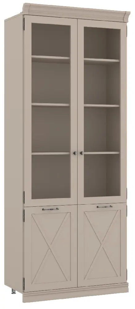- В верхнем отделении — три съемные полки ЛДСП за двумя распашными рамочными дверями (вставки стекло), в нижнем отделении — одна съемная полка ЛДСП за двумя распашными рамочными дверями;