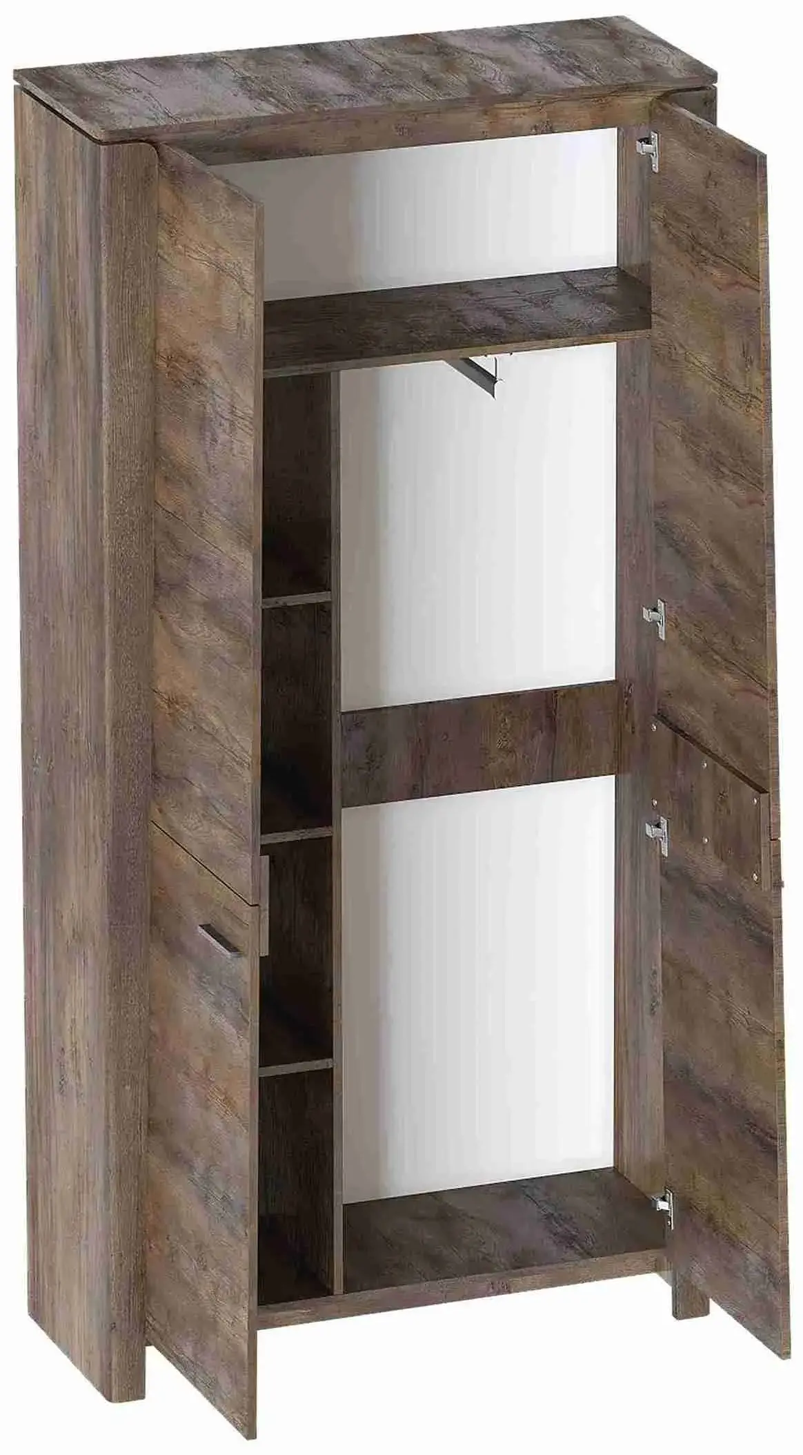 Внутреннее пространство шкафа разделено полкой на платяное с продольной стальной штангой и верхнее отделение для хранения белья. Фасады выполнены из МДФ, преимуществами данного материала являются влагостойкость, экологичность, гипоаллергенность, надёжность и долгий срок эксплуатации.