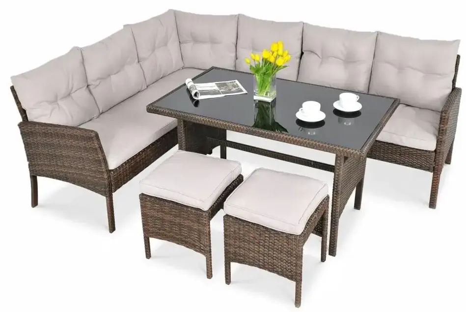 В составе комплекта: Угловой диван из двух, два пуфа и обеденный стол. Высококачественная лоза из полиротанга стойкая к любым атмосферным явлениям. Крепкий стальной каркас с полимерным антивандальным покрытием и отличным качеством сварки.