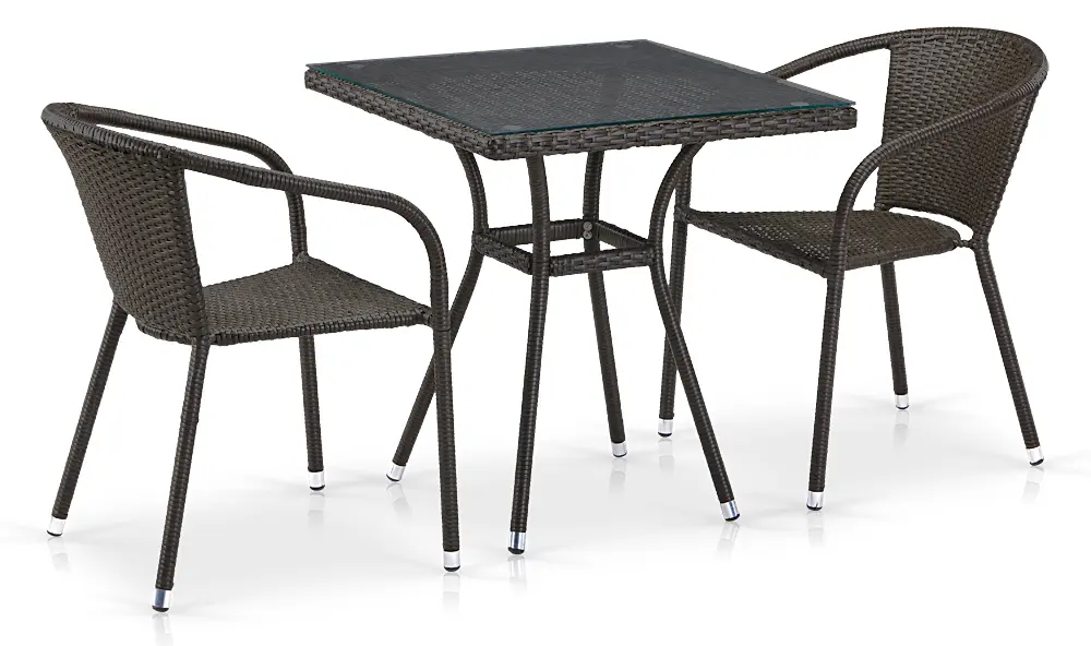 Комплект плетеной мебели на 2 персоны - стол и 2 стула. Можно использовать как кофейный комплект или небольшую обеденную группу в кафе или на даче.