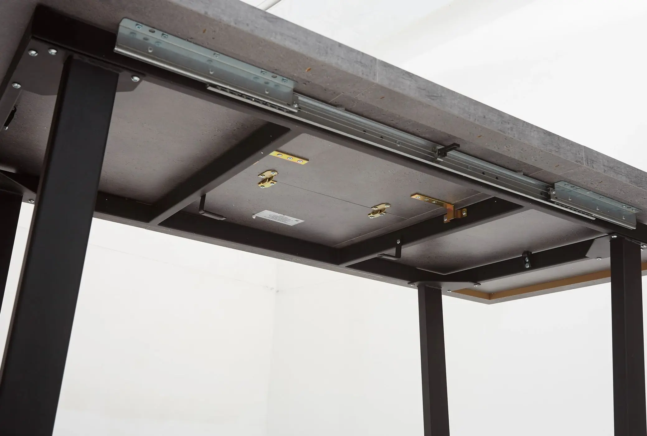 Раскладной обеденный стол. Современный и минималистический дизайн. Столешница - ламинированный ДСП. Толщина столешницы 35 мм по бортикам, 18 мм - по центру. Немецкий механизм раскладывания POTTKER. Металлическая рама под столешницей. Ножки стола крепятся к металлической раме.