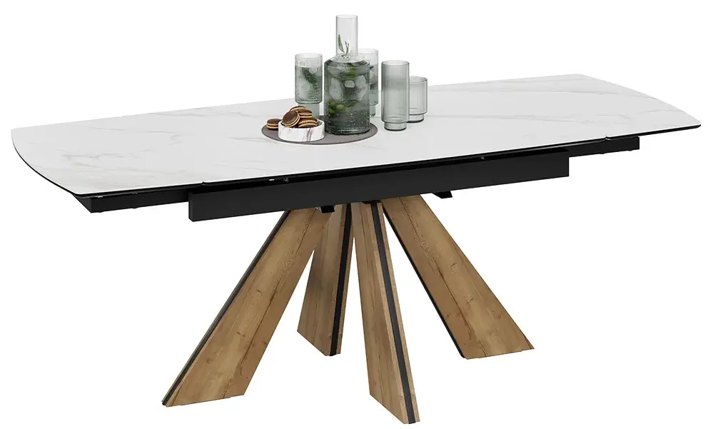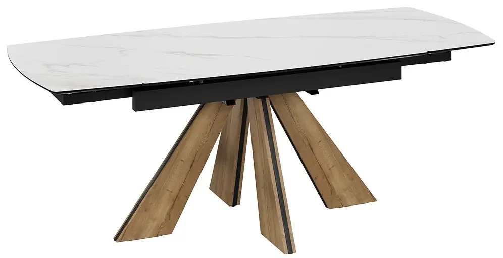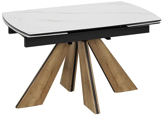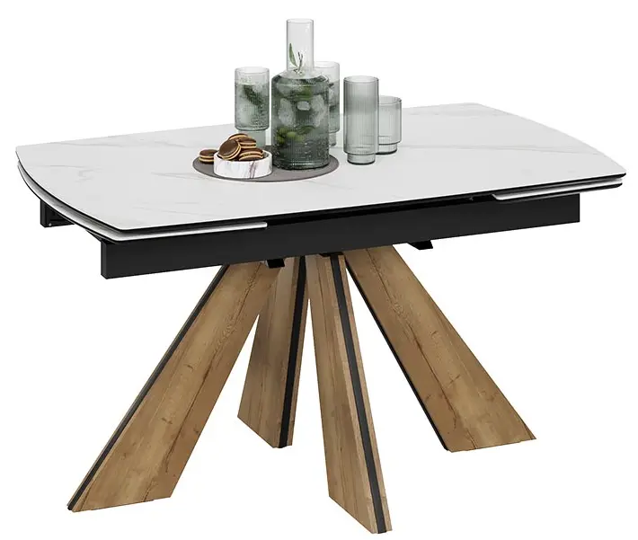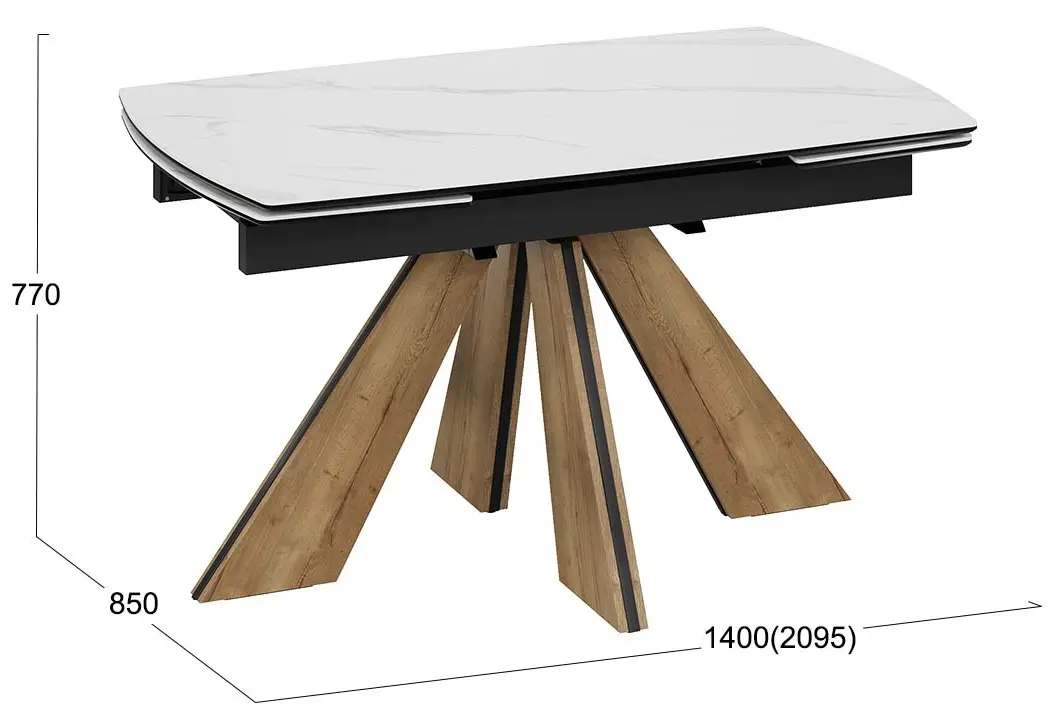 Выразительные формы столешницы и торцевых вставок, выполненных из МДФ 16 мм с керамогранитом 6 мм, смягчают скругленные углы. Керамогранит отличается высокой прочностью, долговечностью, надежностью и термостойкостью. Он не требует особого ухода и не подвержен повреждениям при регулярном использовании. Опора стола выполнена из металла с накладками ЛДСП EGGER 16 мм, в актуальном декоре «Дуб галифакс натуральный».
