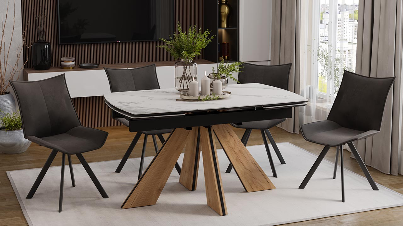 «Палмер» Тип 1 – современный обеденный стол с керамогранитом, выделяется ярким и запоминающимся дизайном, сочетанием материалов и практичностью. Благодаря экстравагантному и устойчивому подстолью модель станет центром притяжения внимания и создаст эффектный и респектабельный интерьер.