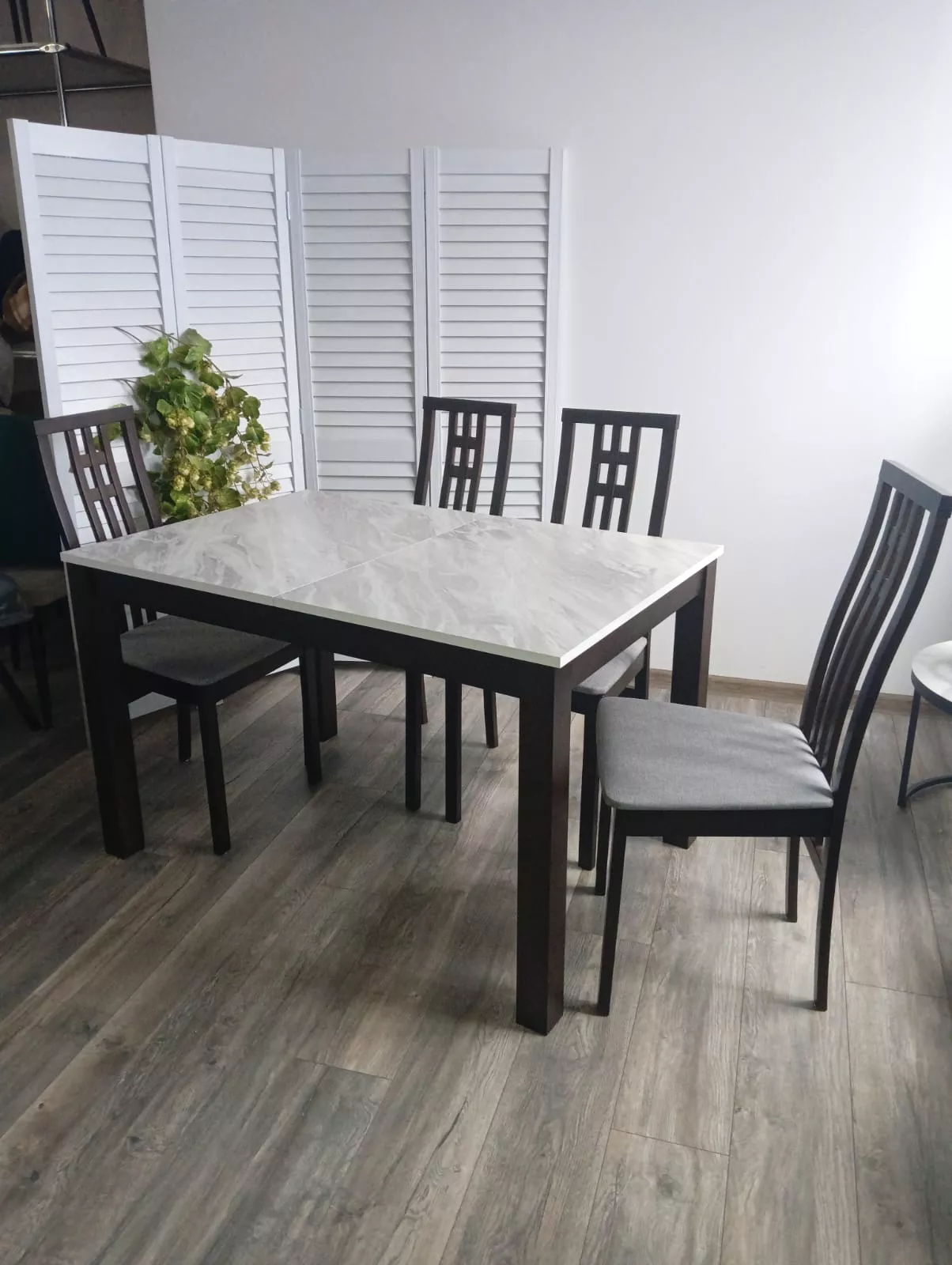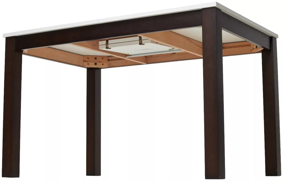 Ножки стола выполнены из массива бука в цвете темный орех, столешница - мдф ламинированный. Раскладной. Вставка "бабочка" в центре столешницы.