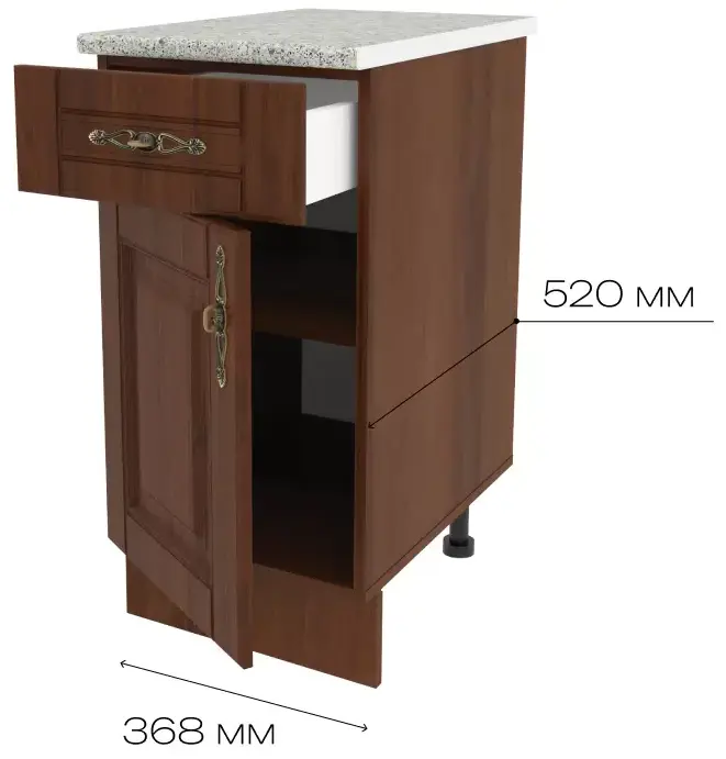 Стильное решение для классической кухни, выполненное в благородном цвете темного дерева. Фасады выполнены из МДФ и обладают высокой надежностью, долговечностью и практичностью. МДФ-панели покрыты пленкой ПВХ эффективно защищающей фасады от выцветания, истирания поверхностей и потери внешней привлекательности.