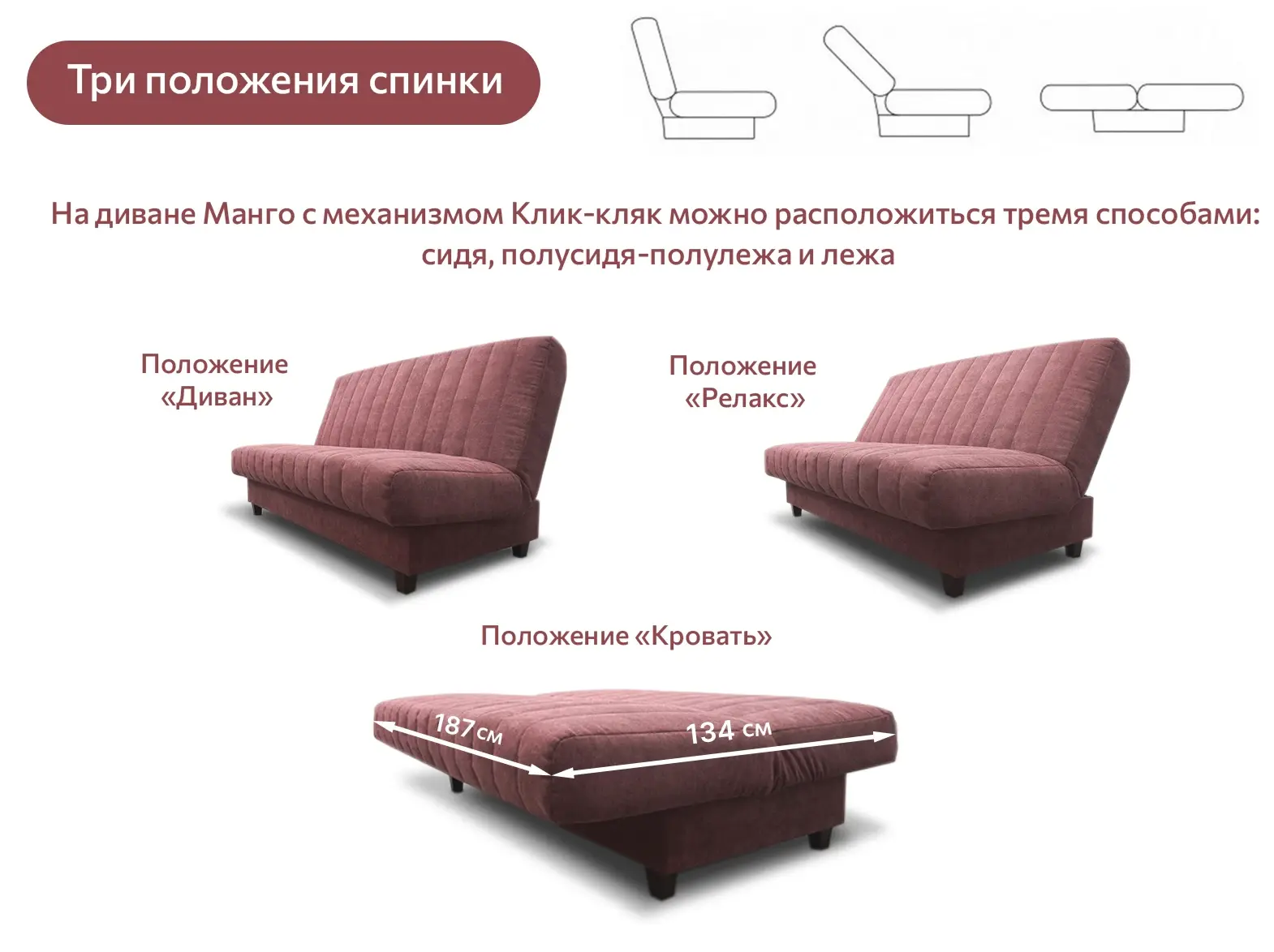 Высококачественный велюр не только тактильно приятен, но также обеспечивает высокую износоустойчивость. Механизм "Клик-Кляк" позволяет привести диван в три положения (вертикальное для сидения, горизонтальное для сна, промежуточное для релакса). Съёмный, стеганный чехол дополняет практичности и возможности длительного сохранения товарного вида мебели.