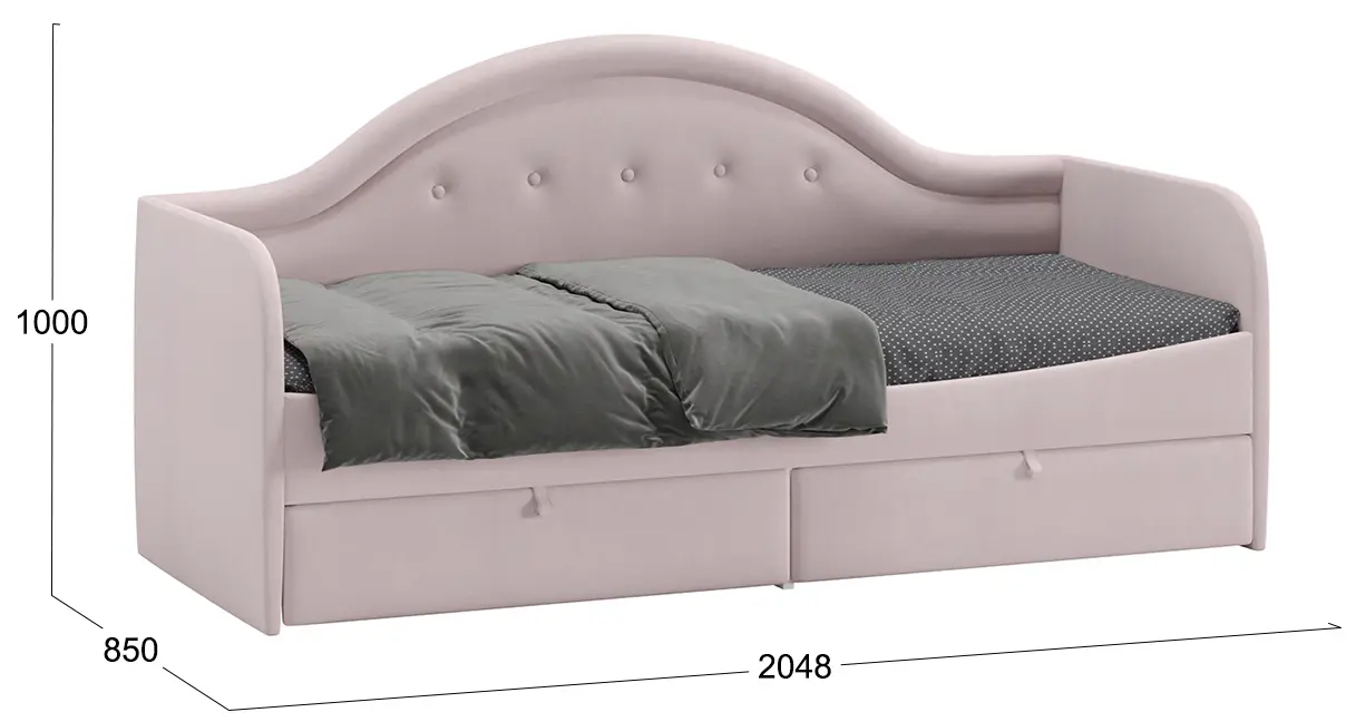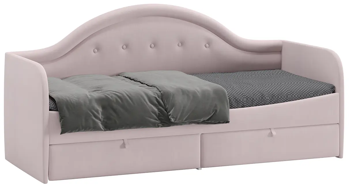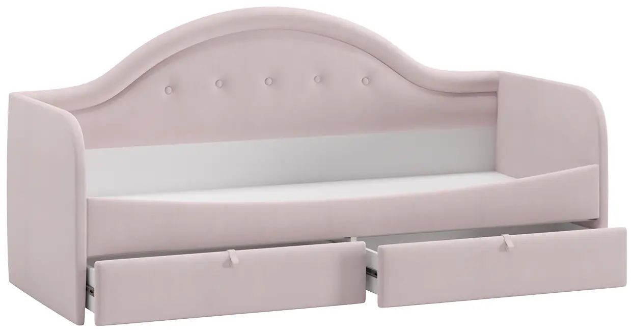 Благодаря своей конструкции кровать отлично разместится вдоль стены и сохранит полезное пространство комнаты. Днем это замечательный диванчик, а ночью – спальное место. Важной деталью комнаты является возможность рационального хранения, поэтому кровать оборудована двумя выдвижными ящиками, которые пригодятся для хранения игрушек и постельного белья.