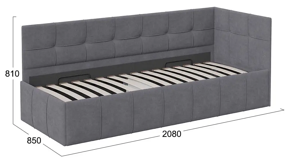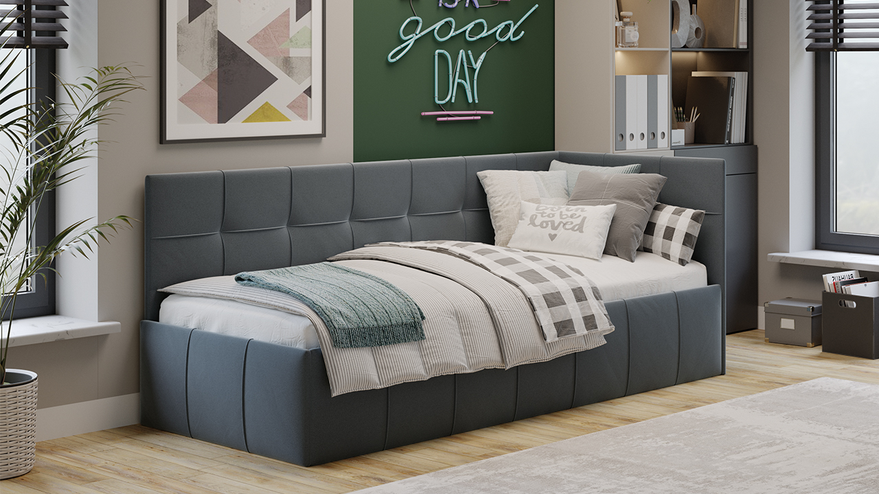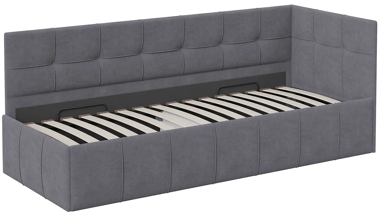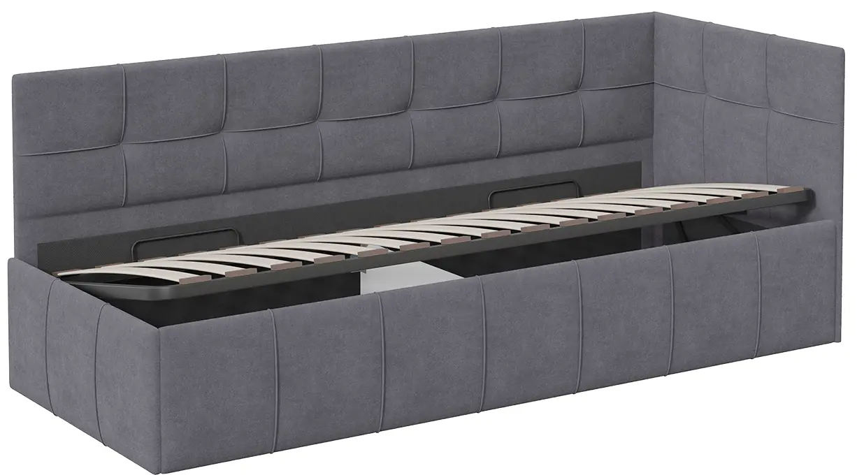 Модель обладает универсальной угловой формой, которая позволяет разместить угол как с левой, так и с правой стороны в зависимости от планировки комнаты. Важной и функциональной деталью является возможность рационального хранения, поэтому кровать оборудована подъемным механизмом, обеспечивающим верхнюю фиксацию и удобный доступ к месту для хранения.