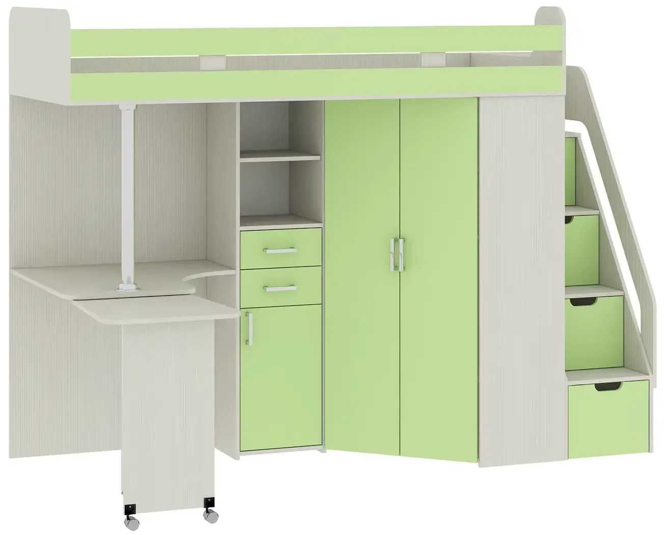 Шкаф для одежды оборудован горизонтальной штангой для вешалок и полками для белья. Лестница на 2-этаж выполнена в виде стеллажа с 2-мя выдвижными ящиками, 3-мя нишами с откидными дверцами и бортиком-поручнем.