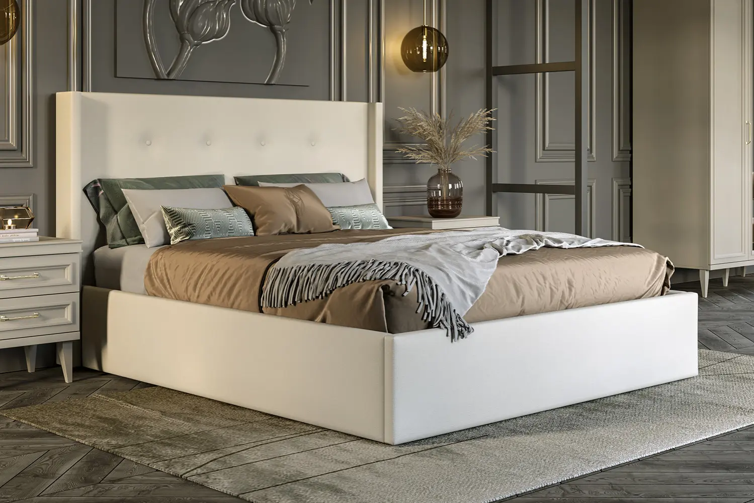 Продуманный дизайн двуспальной модели обеспечит качественный ночной отдых, а мягкое изголовье позволит максимально расслабиться перед сном. Обивка из износостойкой ткани с эластичным наполнением гарантирует безопасность эксплуатации мебели — хозяевам больше не придется волноваться об острых углах в темноте.