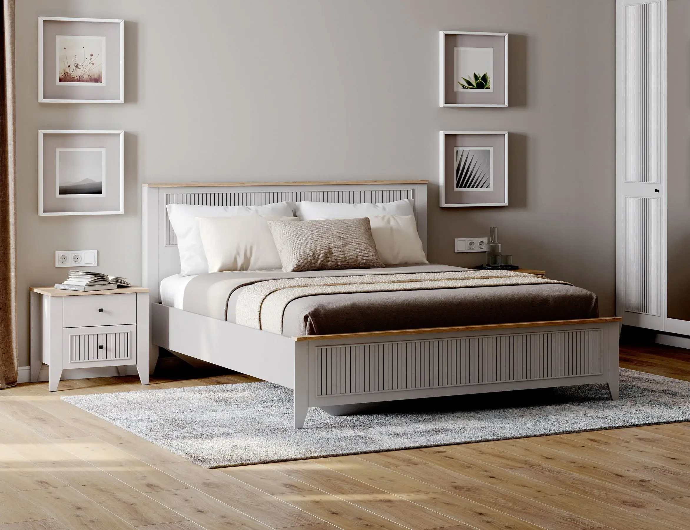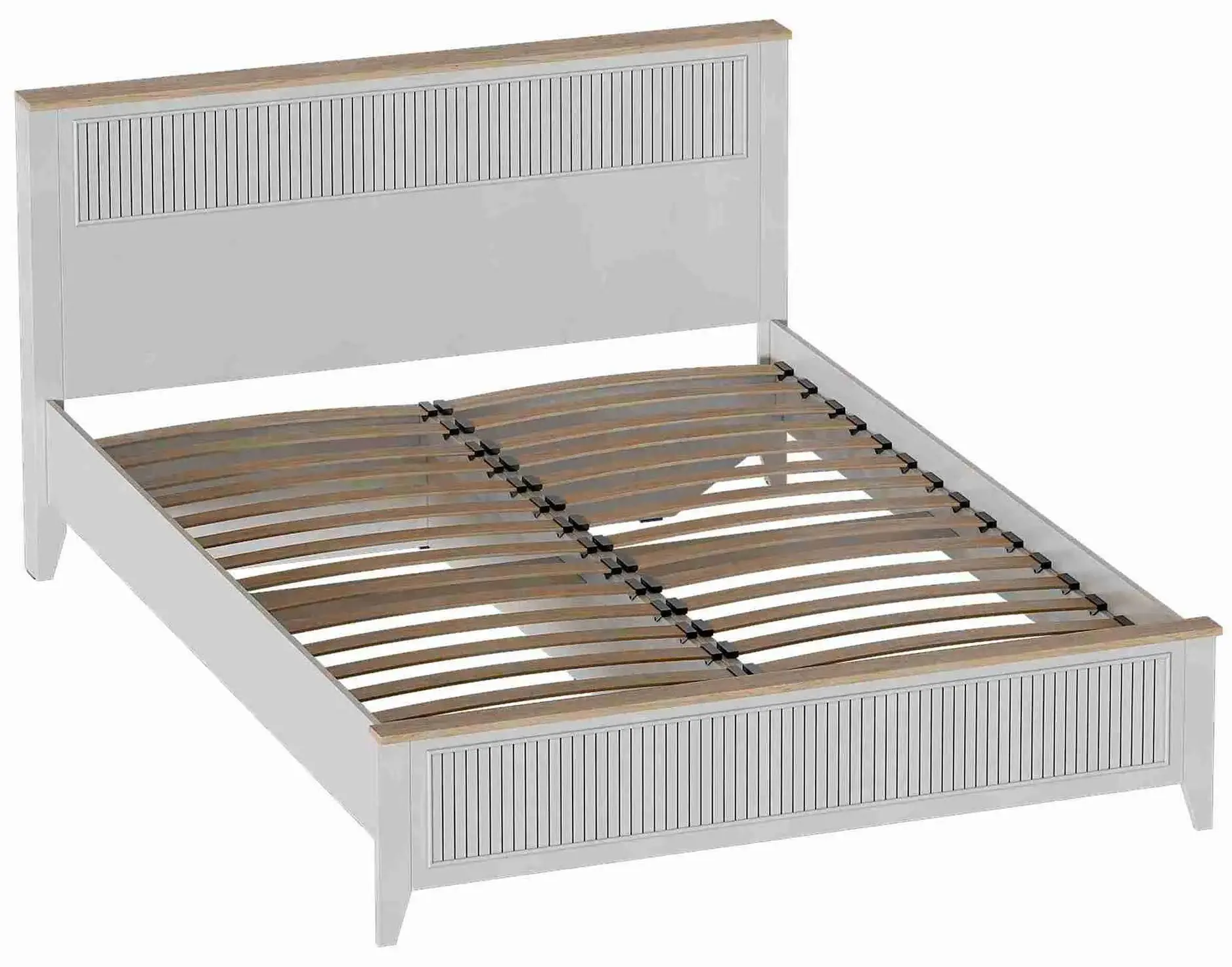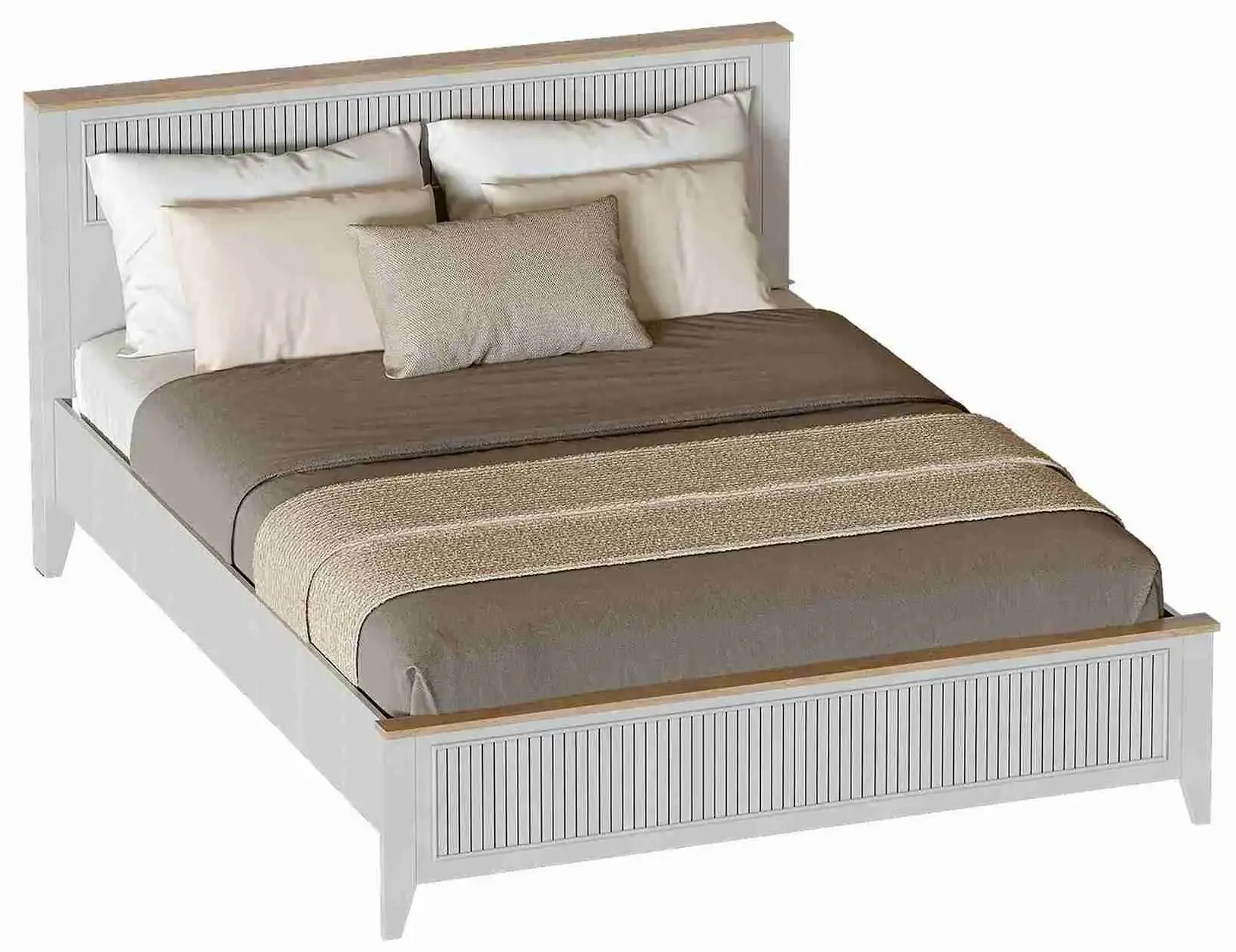 Кровать Валенсия выполнена из ЛДСП в комбинации Дуб натуральный светлый / Персидский жемчуг. УФ-фотопечать полосок на изголовье и изножье в обрамлении пластиковых молдингов придает изделию оригинальный стиль современной классики. Кроватное основание с деревянными ламелями встроено в конструкцию кровати. Высота опор 104 мм. На опорах размещены войлочные подпятники.