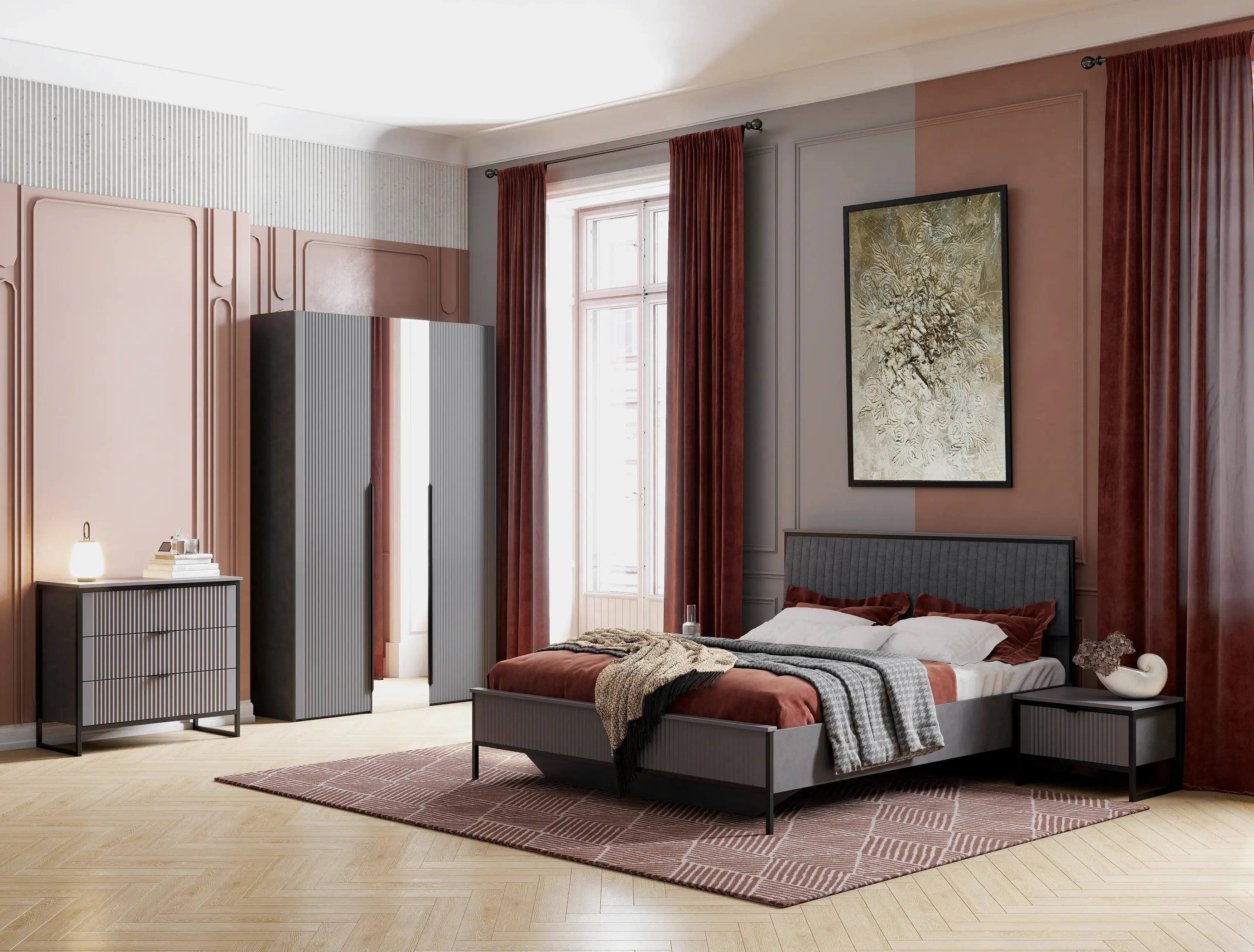 Коллекцию модульной спальни "Нора" отличает современный оригинальный стиль. Декоративная продольная фрезеровка на фасадах из МДФ и опоры на металлокаркасе цвета "Черная эмаль" соответствуют модным тенденциям этого года в ведущих зарубежных коллекциях.
