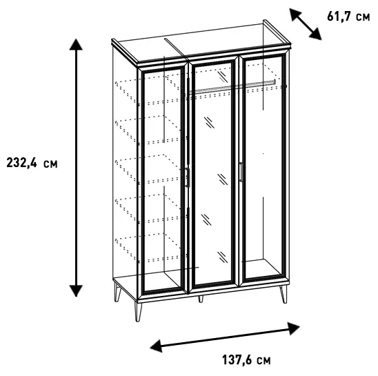 Аккуратные пропорции, симметричность, четкие линии и строгая геометрия делают модель «Орландо» подходящей для создания интерьеров в стиле лофт и минимализм. Трехстворчатый шкаф предназначен для размещения одежды и установки в гостиную, спальню или просторную прихожую. Изделие состоит из двух основных отделений. Первое, более широкое и вместительное, оснащено штангой и двумя полками. Второе, узкое, поделено на шесть одинаковых отсеков.
