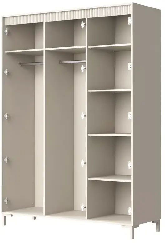 Трехдверный распашной шкаф Свейн - вместительный элемент коллекции, который сочетает лаконичный дизайн и продуманную систему хранения. Спокойная цветовая гамма и мягкие фактуры поддерживают атмосферу спальни и легко комбинируются с другими модулями серии.