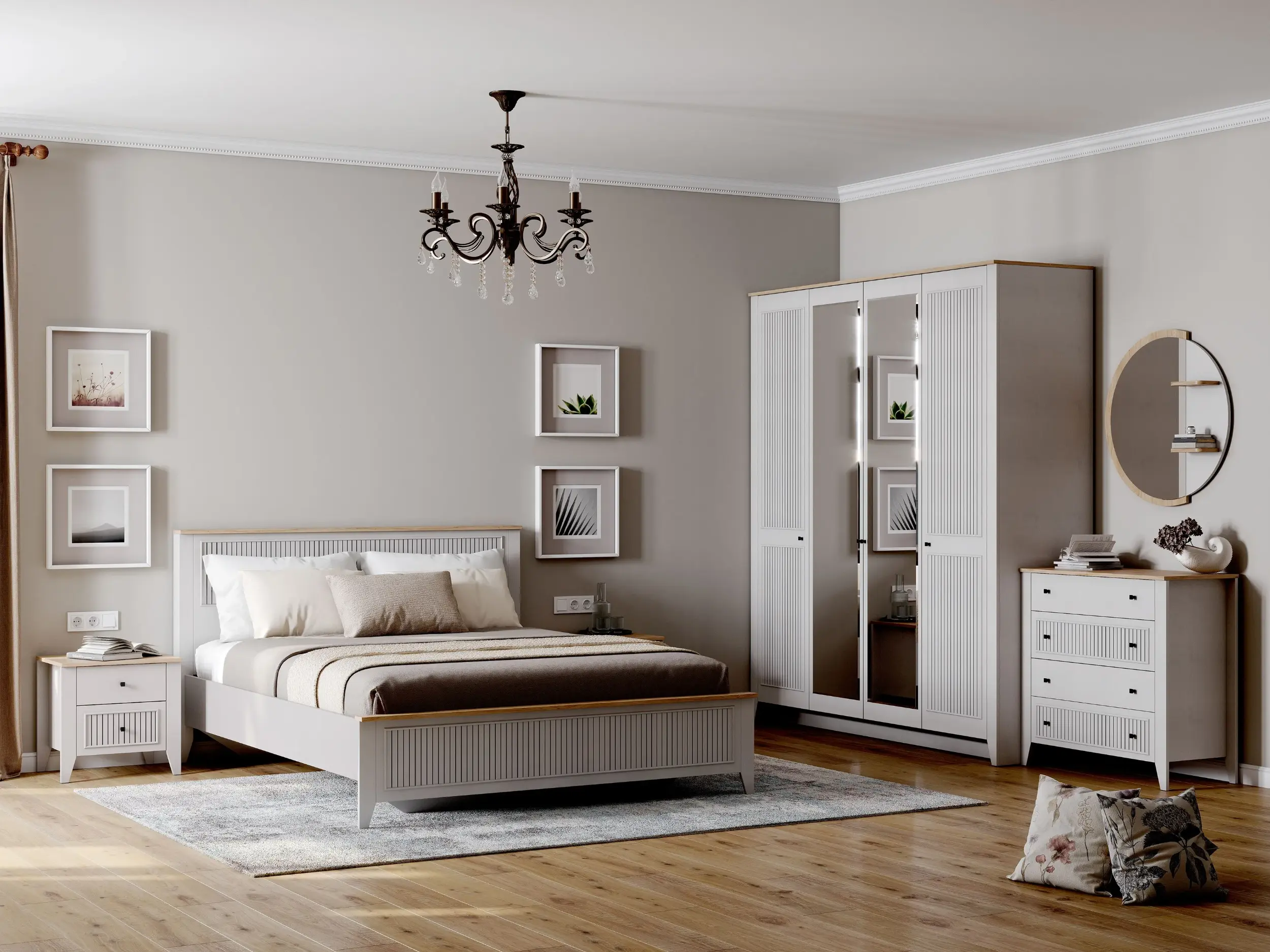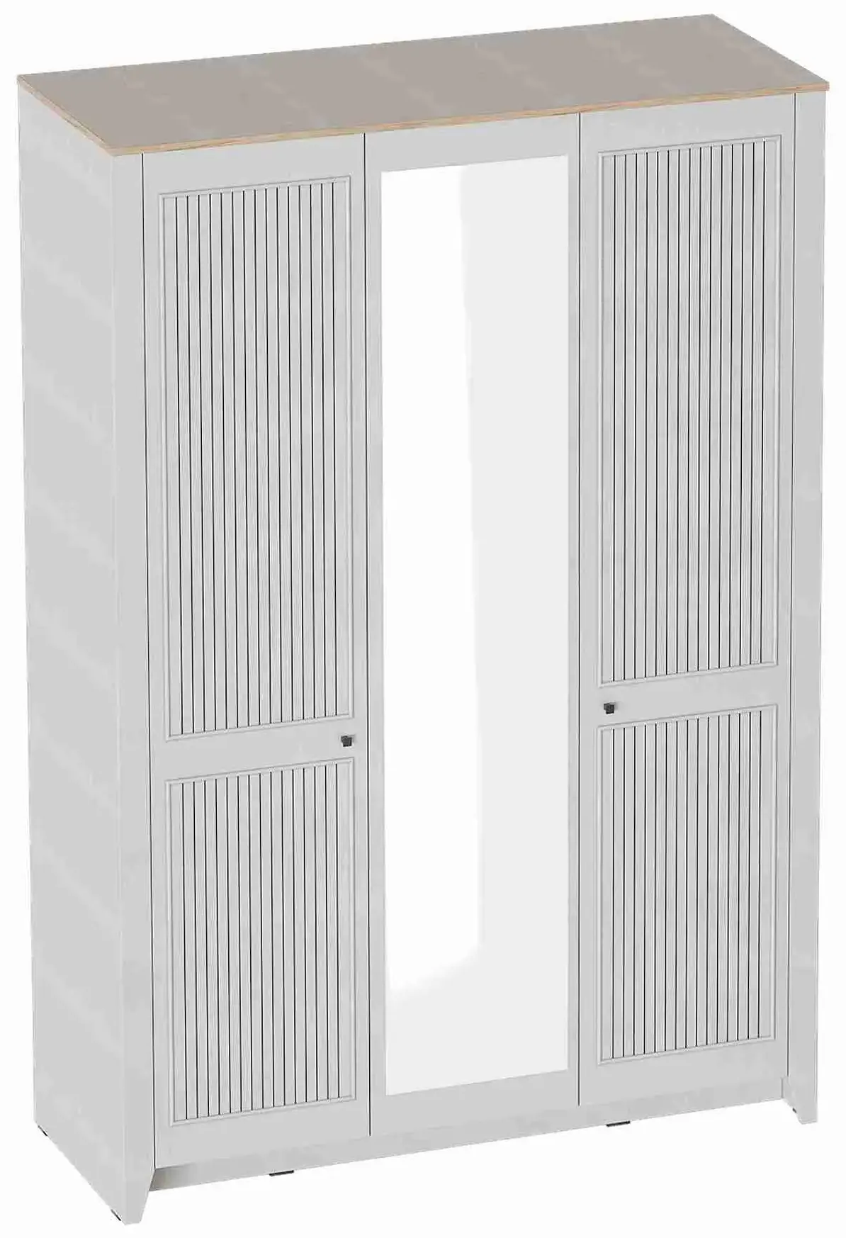 Шкаф 3 дверный Валенсия с зеркалом выполнен из (ЛДСП) в комбинации Дуб натуральный светлый / Персидский жемчуг. УФ-фотопечать полосок на фасадах в обрамлении пластиковых молдингов придает изделию оригинальный стиль современной классики.