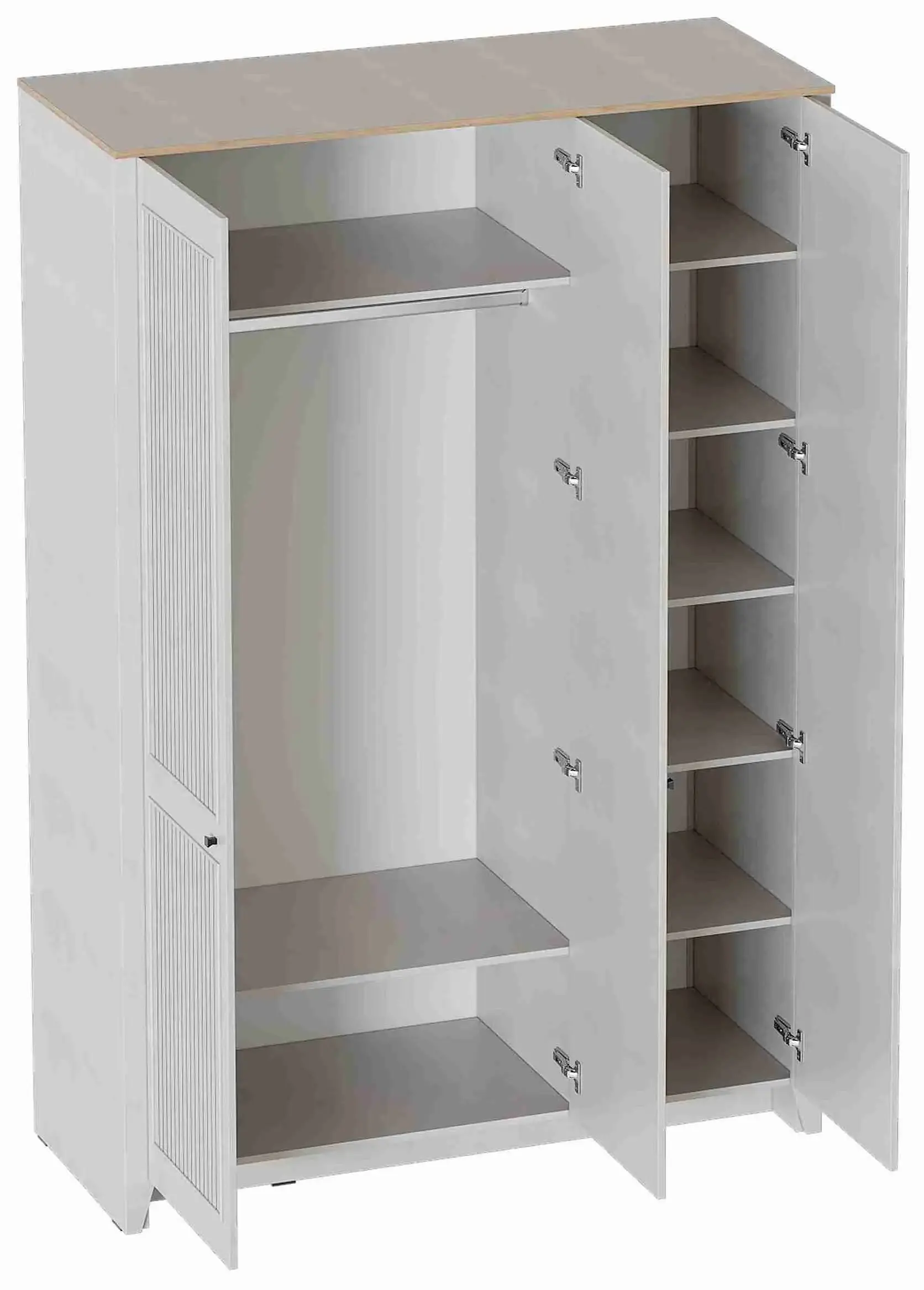 В центральной части шкафа расположена штанга для одежды, а также верхняя и нижняя полки, каждая из которых разделена на два отделения. Правая и левая части шкафа имеют по пять полок высотой 332 мм каждая. Задняя стенка шкафа изготовлена из ХДФ. На опорах размещены войлочные подпятники. Высота опор 104 мм. Зеркало выполнено с фацетом.
