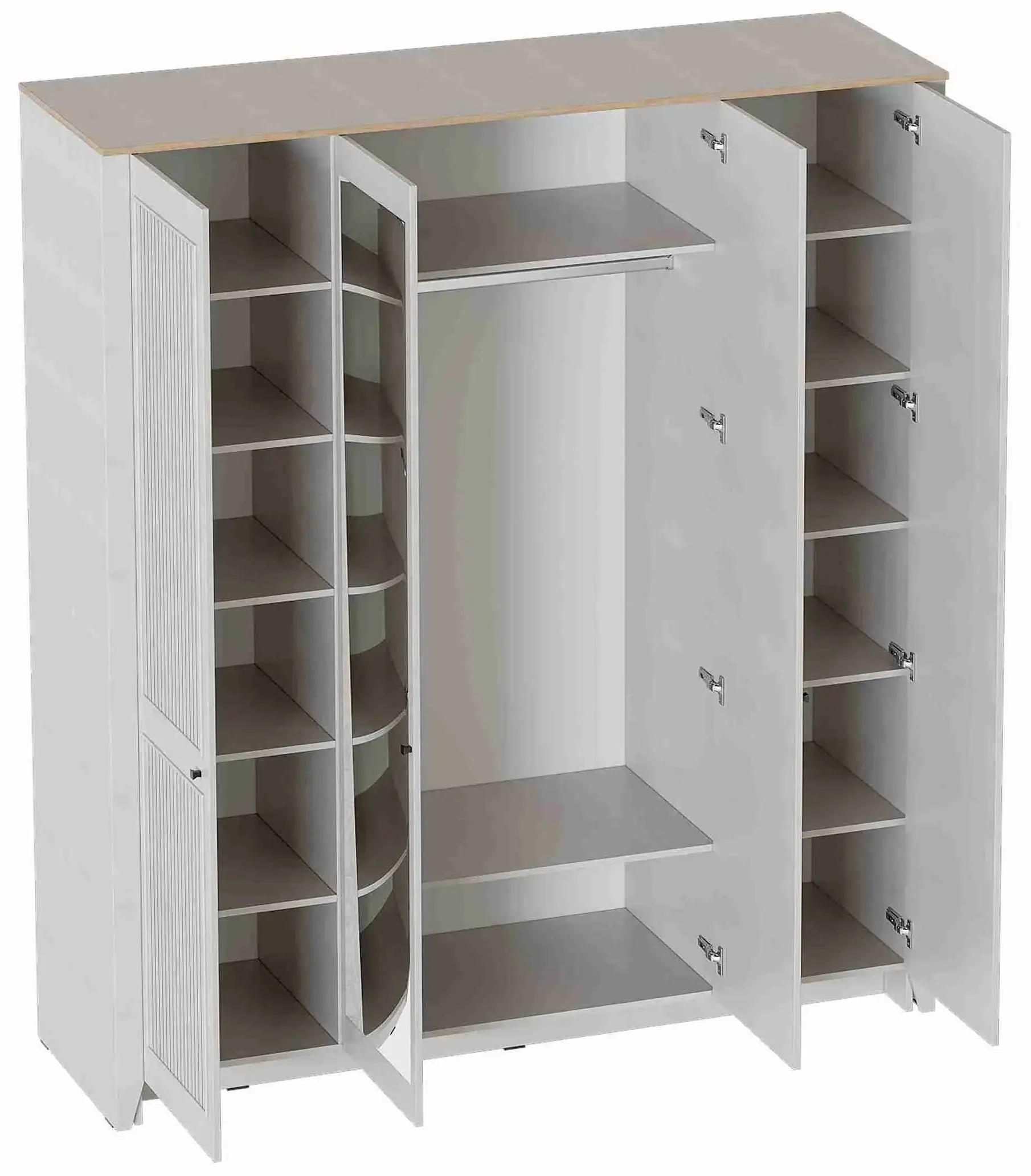 В центральной части шкафа расположена штанга для одежды, а также верхняя и нижняя полки, каждая из которых разделена на два отделения. Правая и левая части шкафа имеют по пять полок высотой 332 мм каждая. Задняя стенка шкафа изготовлена из ХДФ. На опорах размещены войлочные подпятники. Высота опор 104 мм. Зеркало выполнено с фацетом.