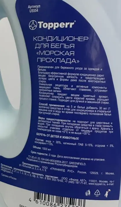 Кондиционер-концентрат для стирки Topperr U5554 «Морская прохлада» благодаря особому составу смягчает волокна, исключая спутывание и разрушение основы ткани. Он эффективно разглаживает складки и делает вашу одежду несминаемой. Объём: 1,5 л.