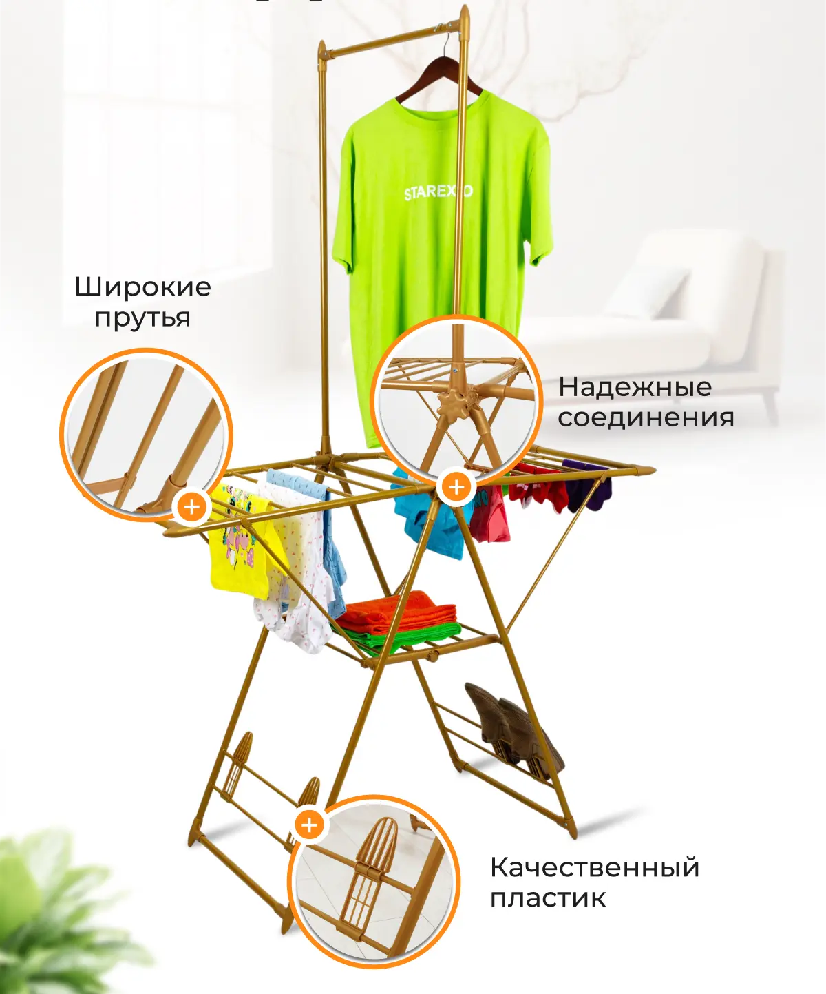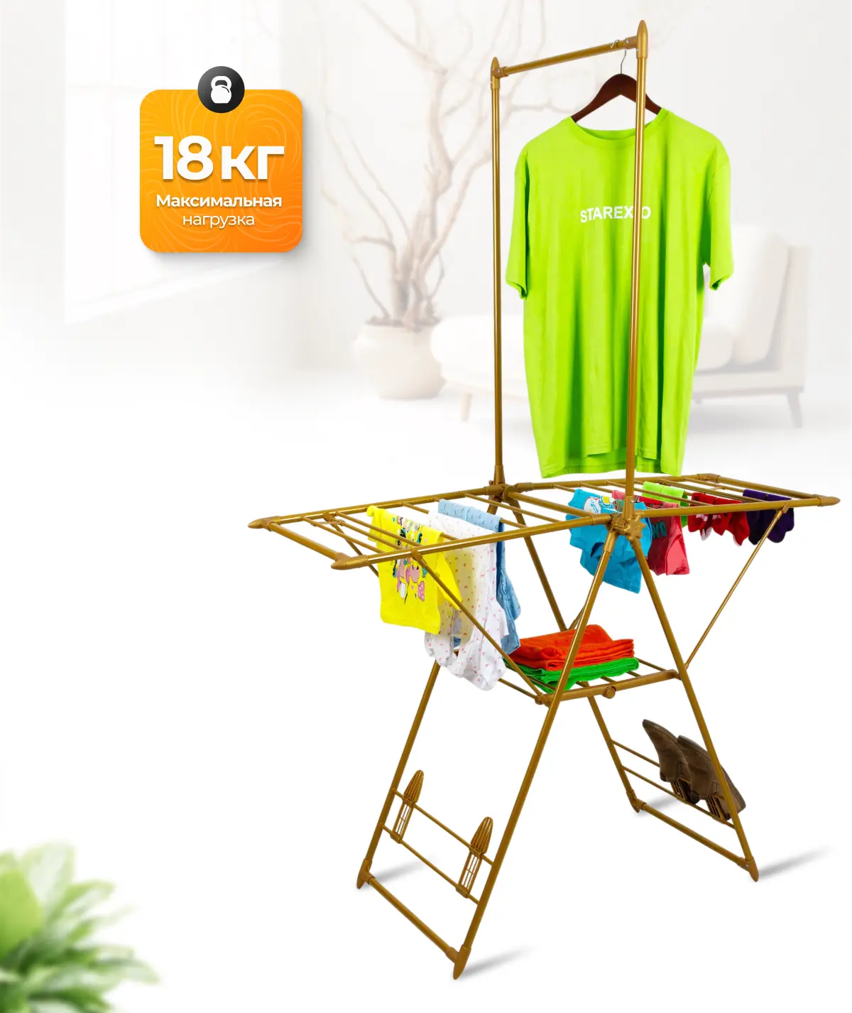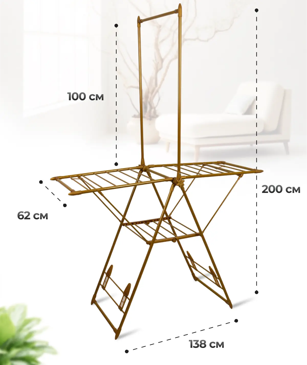 Напольная, раскладная сушилка для белья. Цвет пластиковых элементов: золотой. Суммарная длина линий подвеса 20 метров. Максимальная нагрузка 10 кг. Габариты в разобранном виде: Д138xШ63xВ98-200.