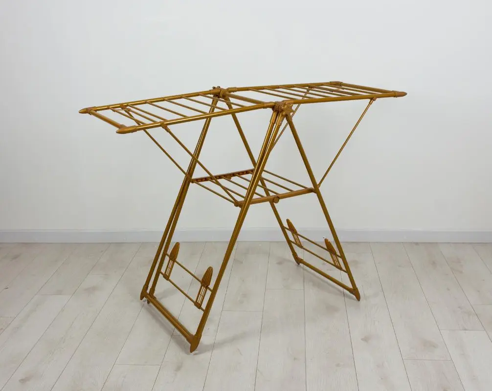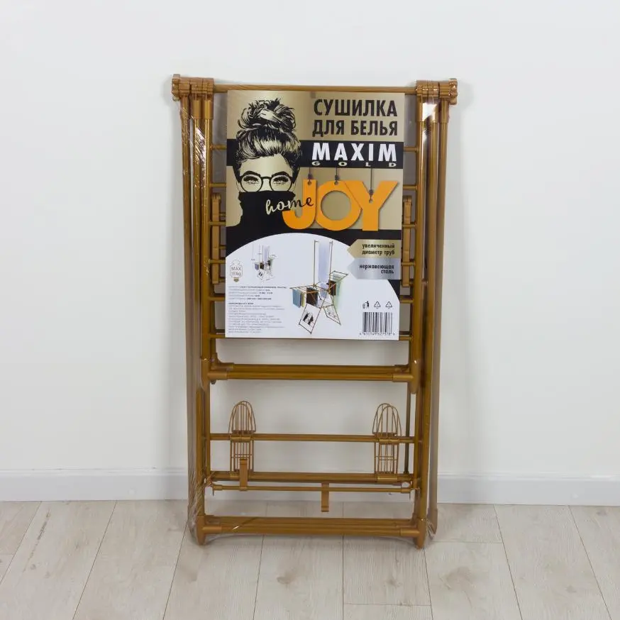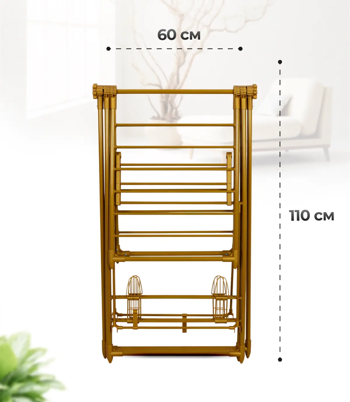 Напольная, раскладная сушилка для белья. Цвет пластиковых элементов: золотой. Суммарная длина линий подвеса 20 метров. Максимальная нагрузка 10 кг. Габариты в разобранном виде: Д138xШ63xВ98-200.