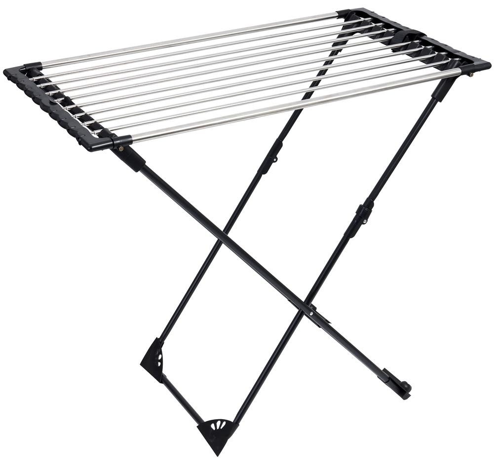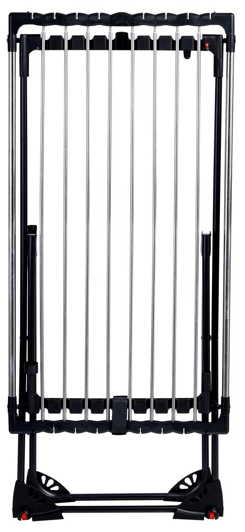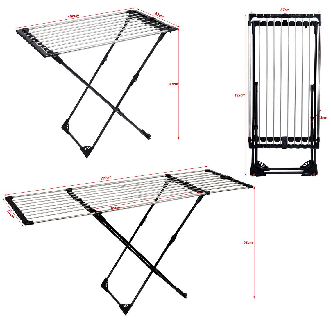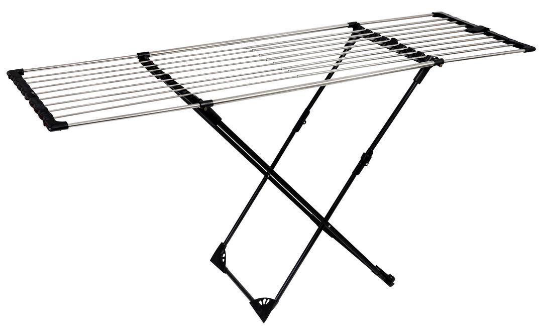 Раздвижная телескопическая сушилка для белья с откидным фиксатором, обеспечивающим возможность сушки длинного белья, зажимы для развешивания небольших предметов одежды, колесики для легкого перемещения. Габариты в разобранном виде: Д108-190xШ56xВ93.