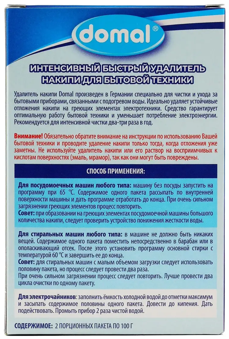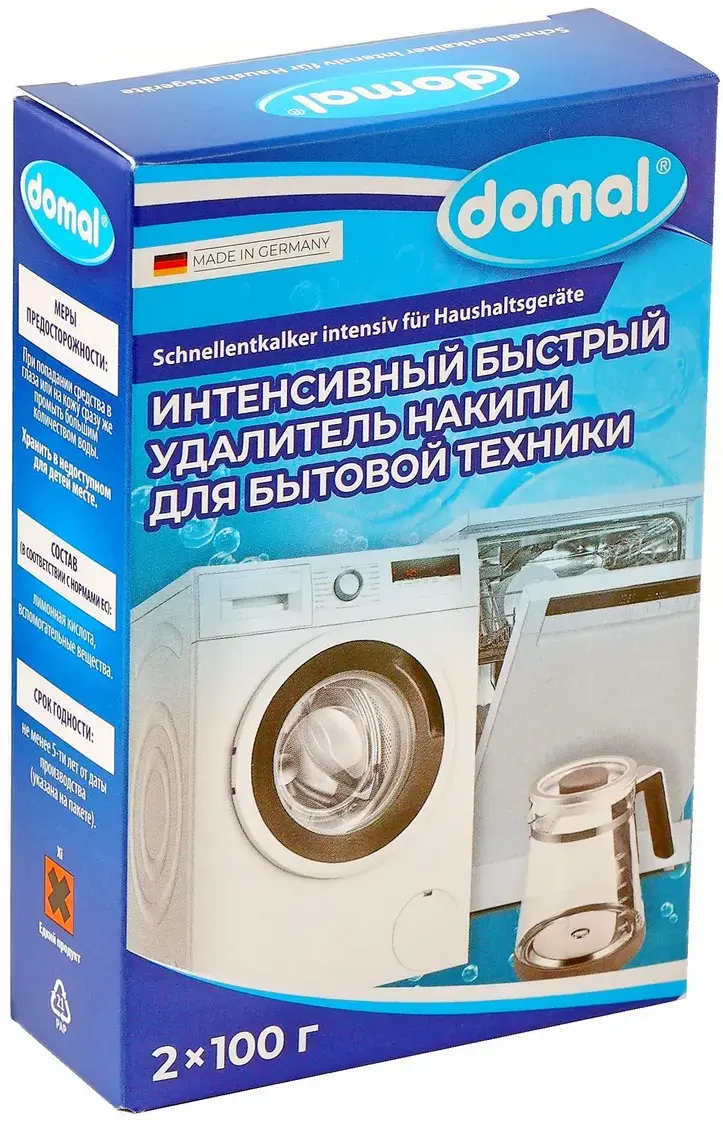 Удалитель накипи Domal произведен в Германии специально для чистки и ухода за посудомоечной и стиральной машиной. Идеально удаляет устойчивые отложения накипи на греющих элементах машины. Средство гарантирует оптимальную работу бытовой техники и уменьшает потребление электроэнергии. Рекомендуется для интенсивной чистки два-три раза в год.