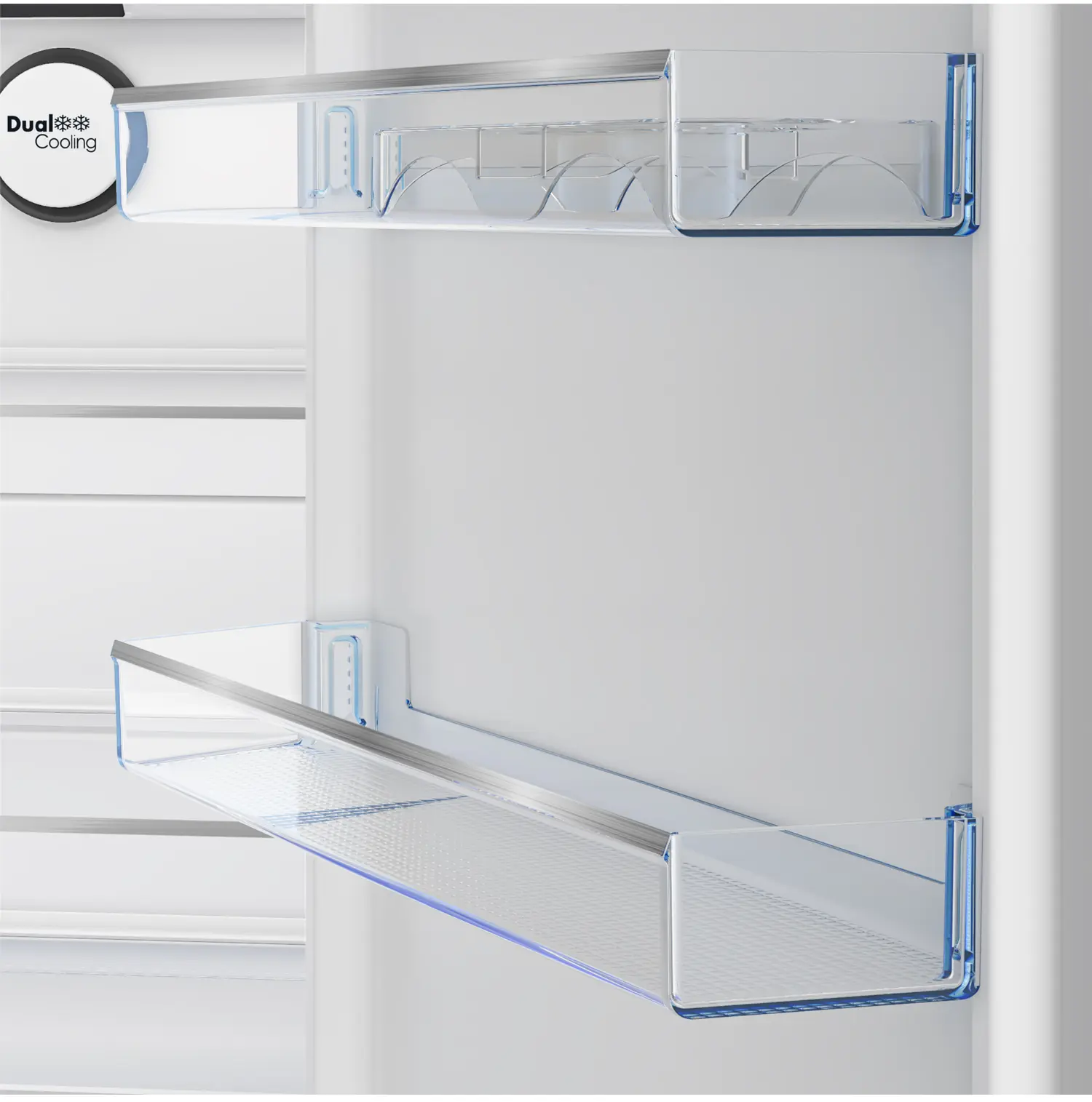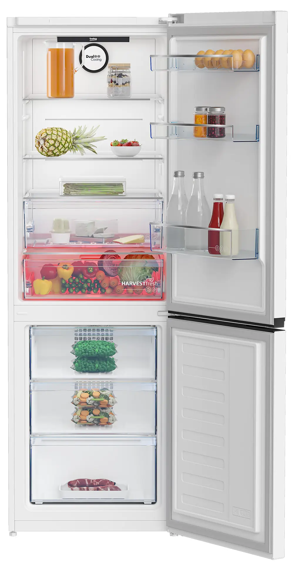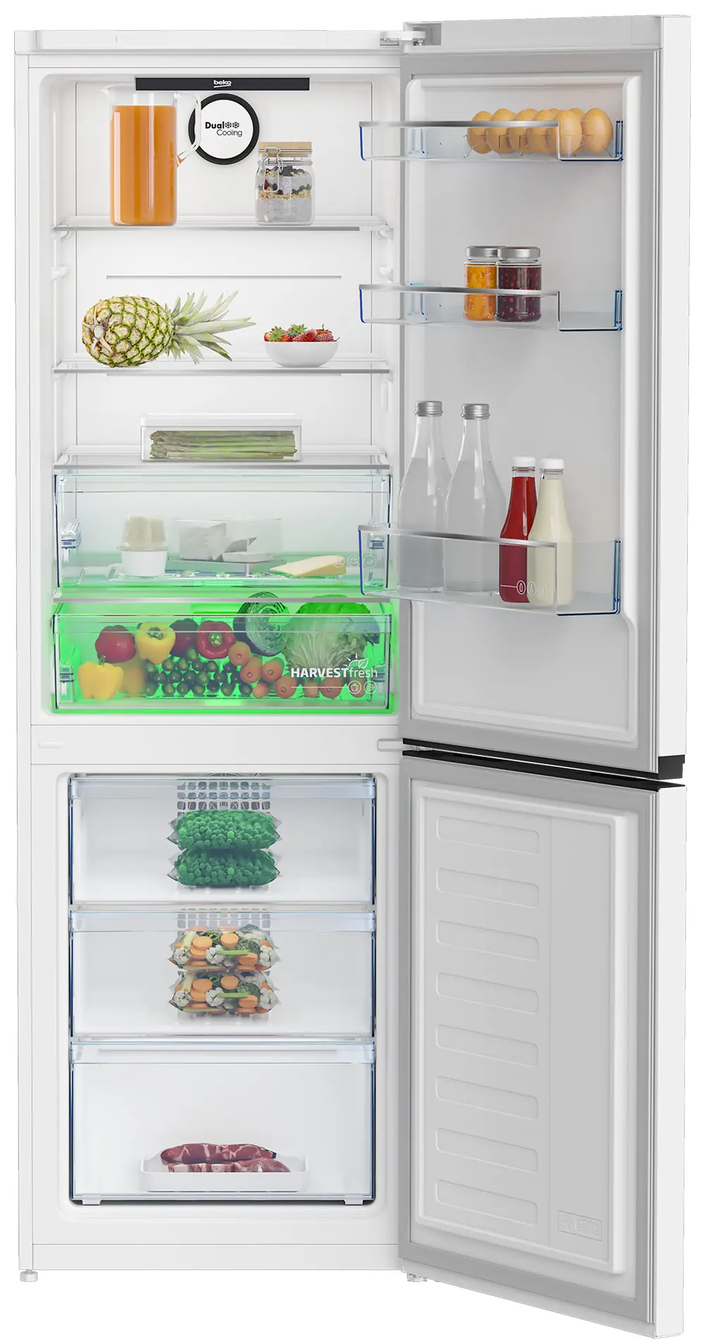 Двухкамерный холодильник Beko с цифровым дисплеем и электронным управлением оснащен двухконтурной системой охлаждения NoFrost Dual Cooling (Ноу Фрост), которая разделяет воздушные потоки между холодильной и морозильной камерами для лучшего охлаждения без смешивания запахов и образования льда на стенках.