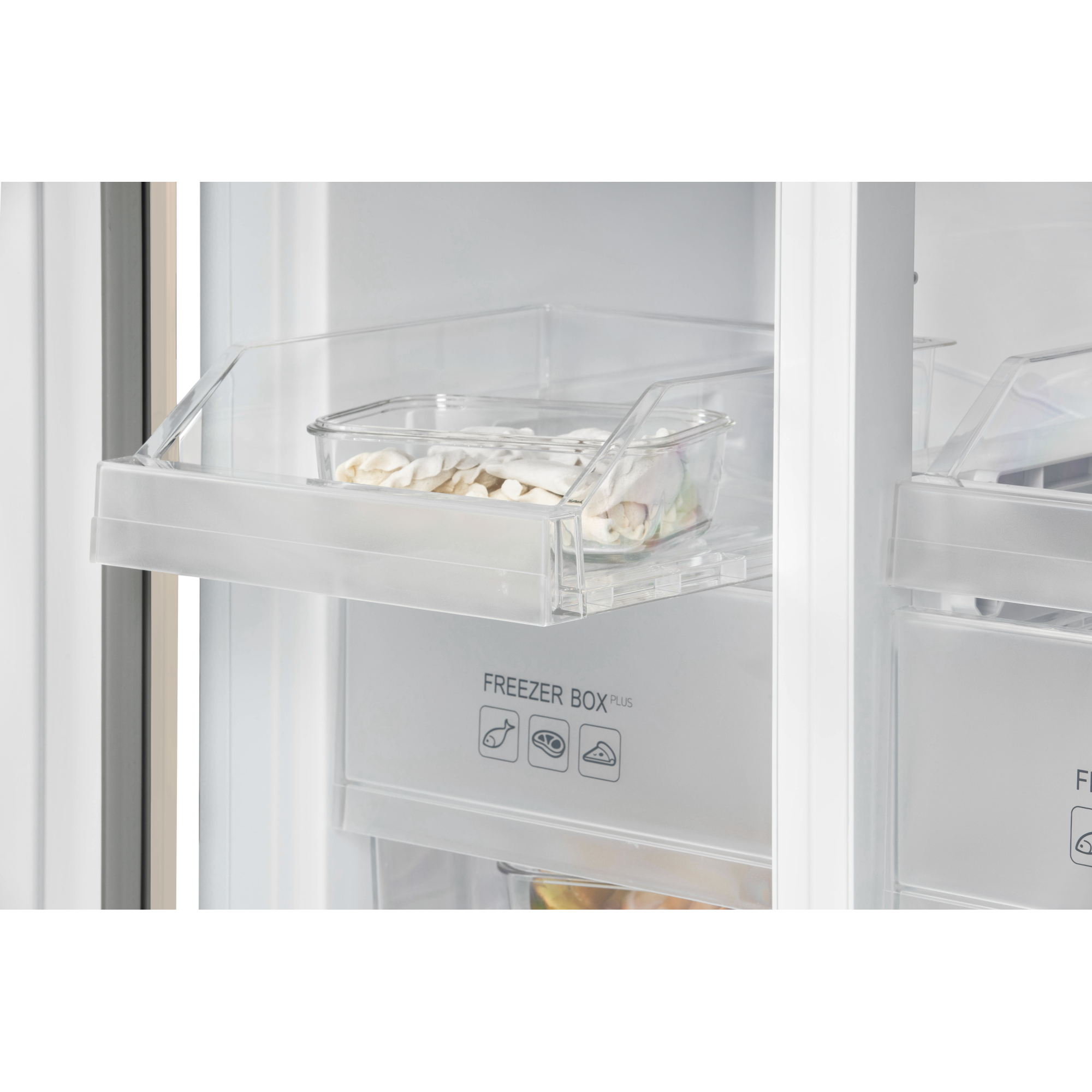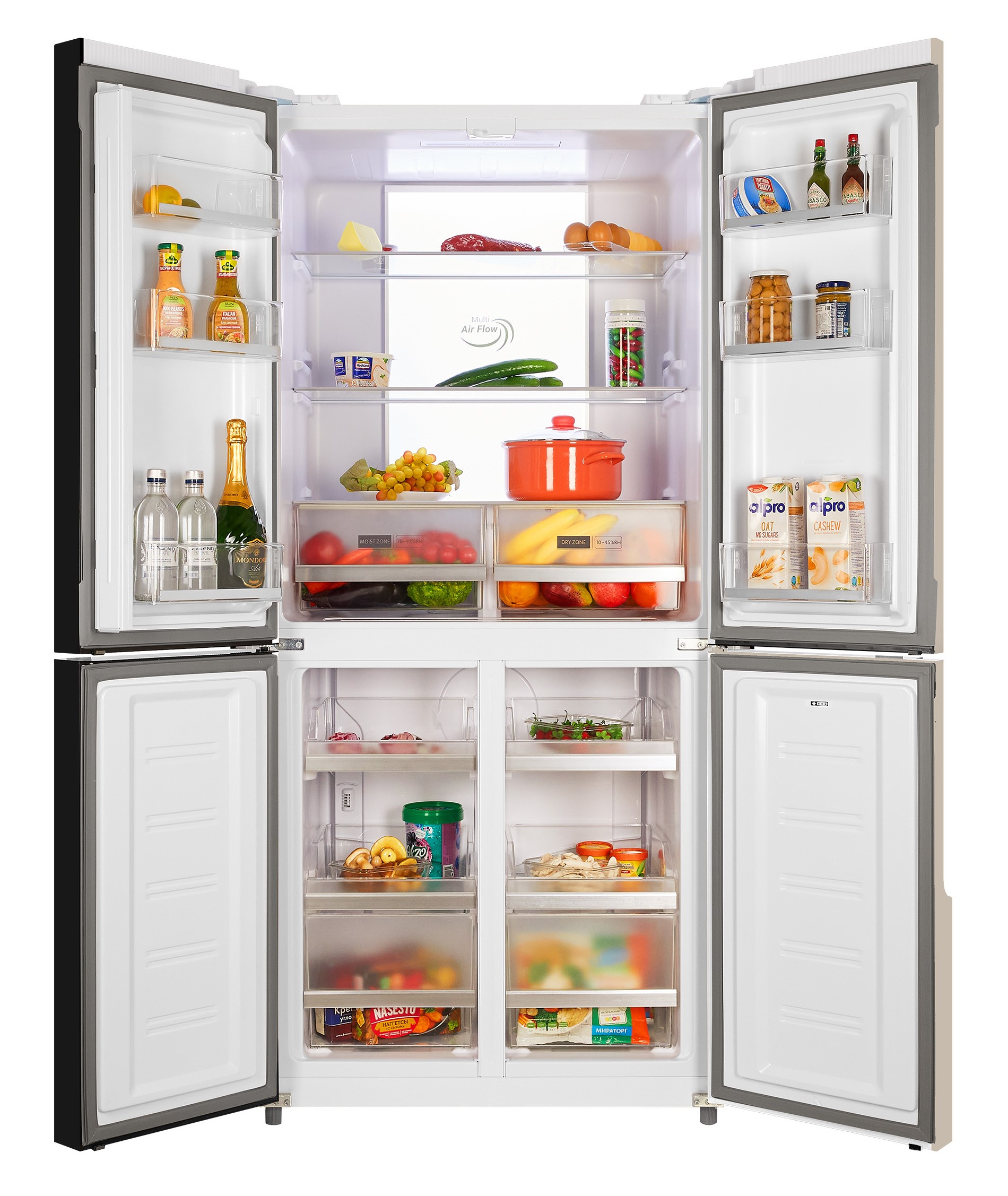 4-х дверный холодильник имеет единое пространство верхних полок холодильной камеры, чтобы удобно было размещать габаритные кастрюли и контейнеры. Прочные полки из закаленного стекла можно регулировать по высоте, а ящики в холодильной камере предназначены для хранения овощей и фруктов и оснащены влажной зоной свежести и сухой.