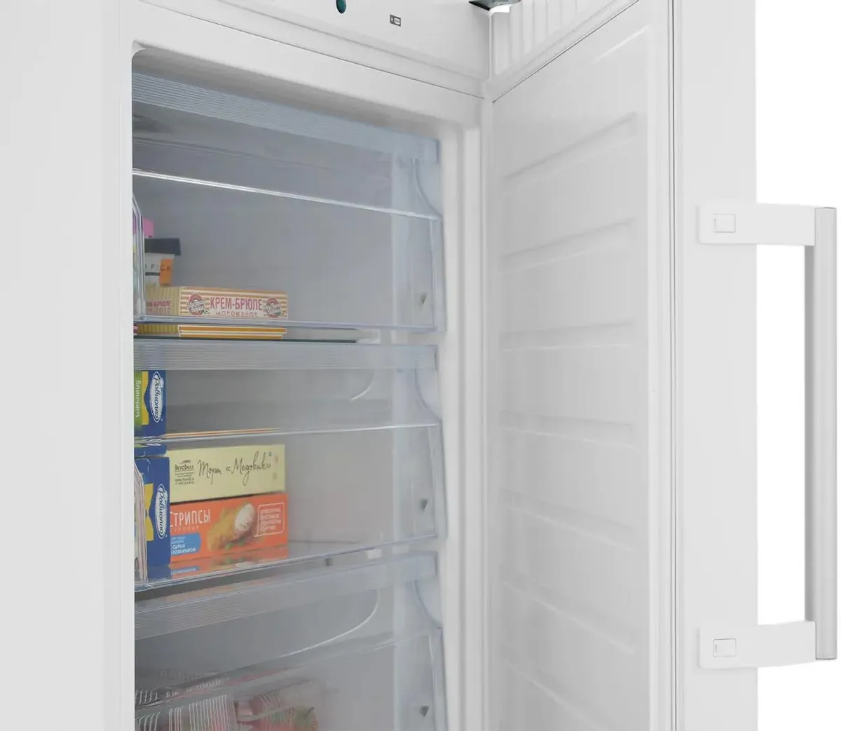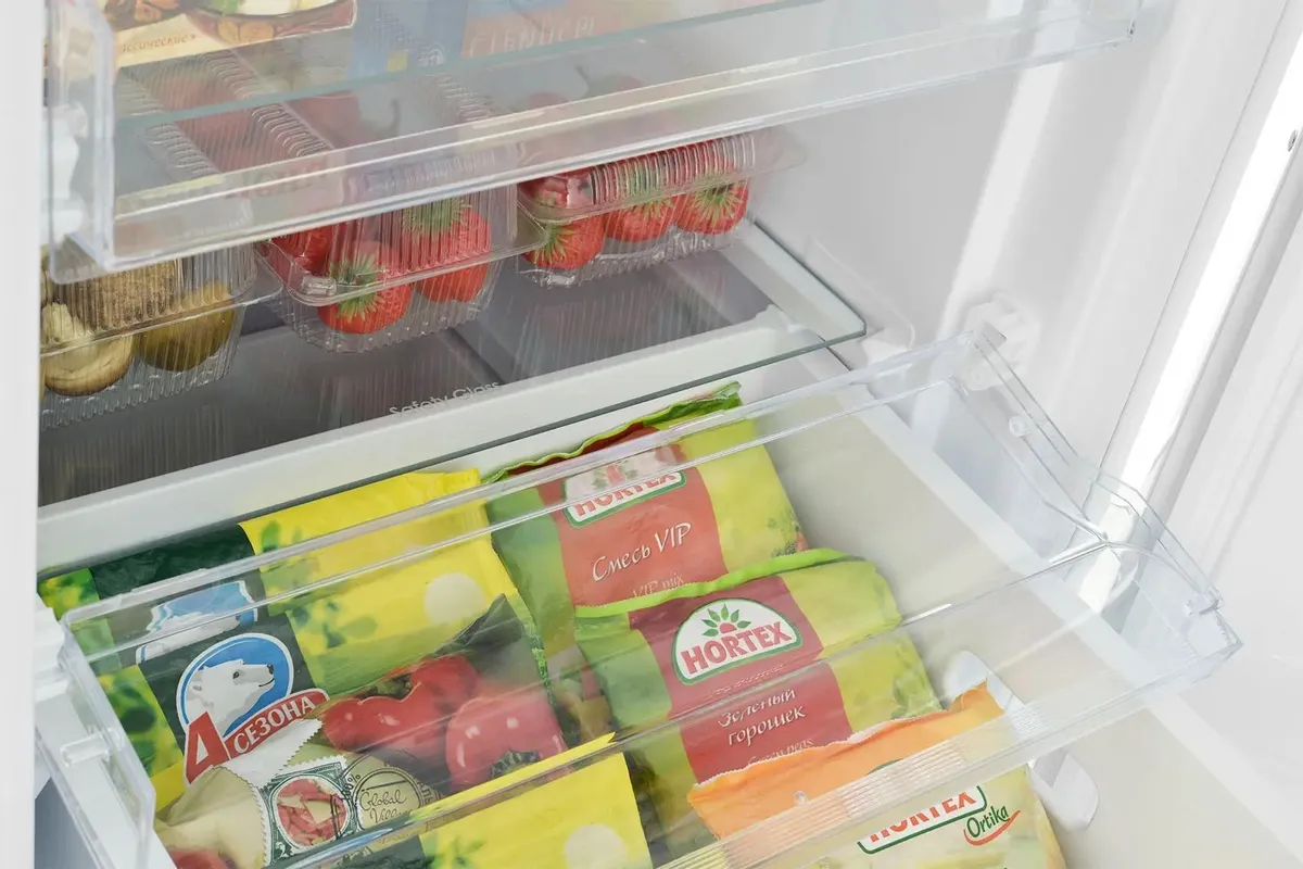 Большой объём — 248 литров — позволяет одновременно хранить в нём много продуктов. Для их удобного размещения предусмотрены выдвижные контейнеры разных размеров, с прозрачными передними стенками.