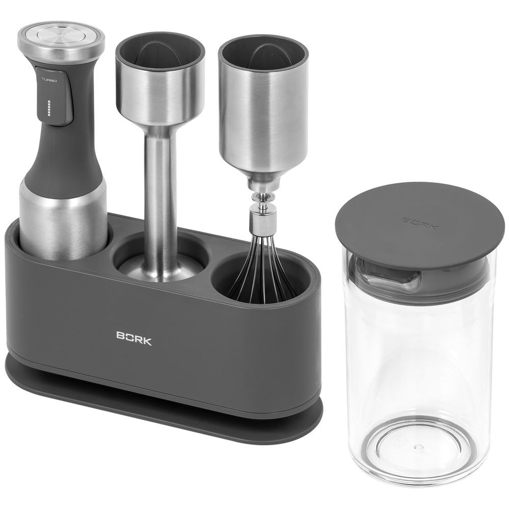 Блендер и насадки удобно хранить благодаря компактной подставке. Лаконичный дизайн для ценителей минимализма и чистых форм.