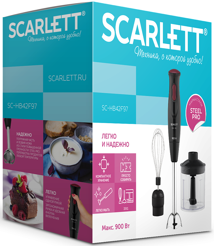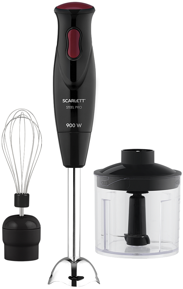 Scarlett SC-HB42F97 — погружной блендер мощностью 900 Вт. Это многофункциональное устройство, предназначенное не только для пюрирования продуктов, но и для взбивания, смешивания и измельчения. Соответствующие насадки входят в комплект. У этой модели 1 кнопка, удобно расположенная на эргономичной рукоятке. Лезвия ножа и рабочие части насадок выполнены из высококачественной нержавеющей стали собственной марки STEEL PRO. Остальные элементы — из пищевого пластика.