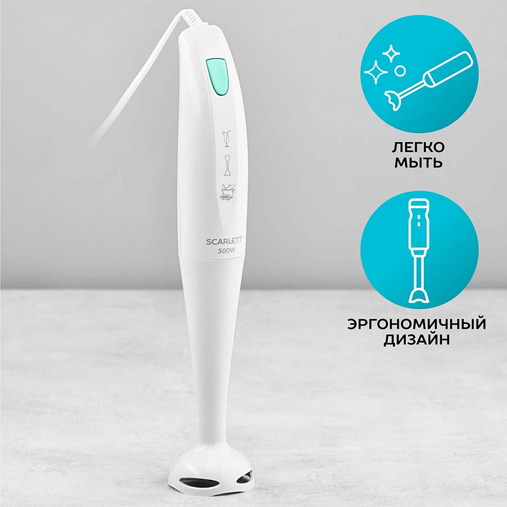 Погружной блендер Scarlett SC-HB42S08 – универсальное устройство, выполненное в классическом белом дизайне, дополненном зеленой кнопкой. Прибор компактен и многофункционален, он легко измельчит и смешает любые ингредиенты. Это незаменимое приспособление, способное максимально облегчить работу на кухне и подарить вам время для отдыха. Блендер оптимальной мощностью 500 Вт управляется одной кнопкой. Нож прибора изготовлен из долговечной нержавеющей стали марки STEEL PRO.