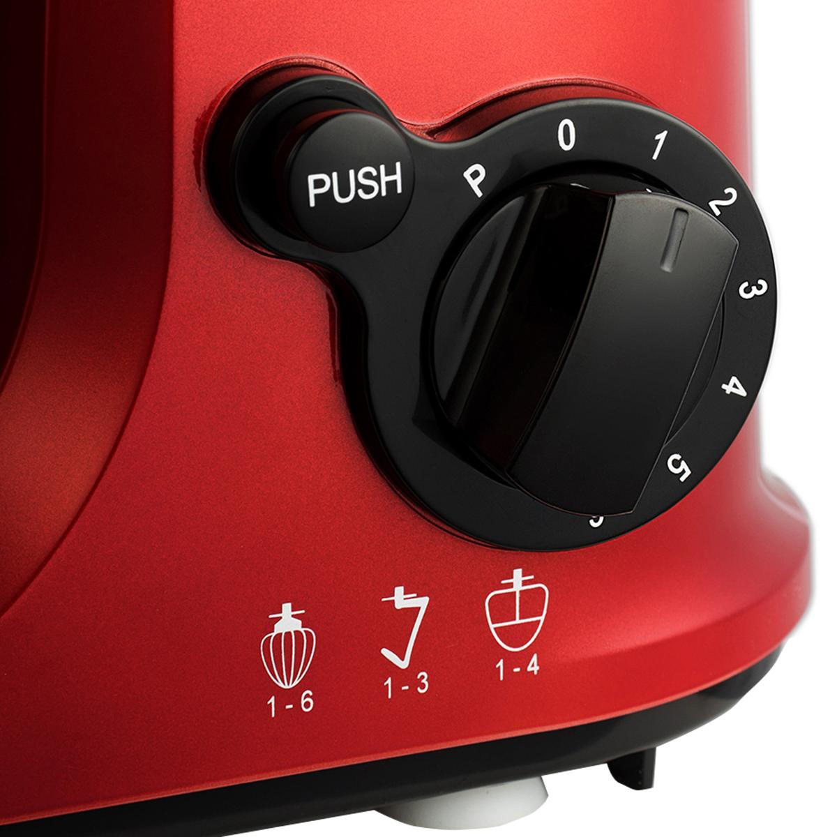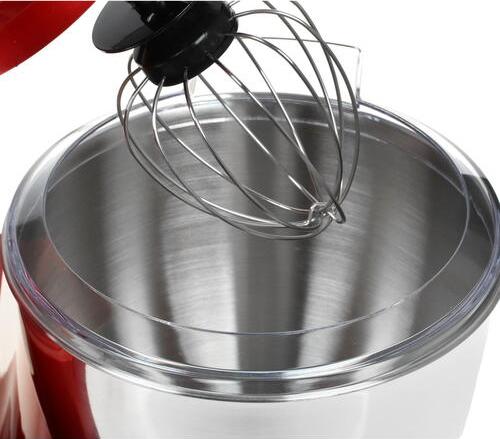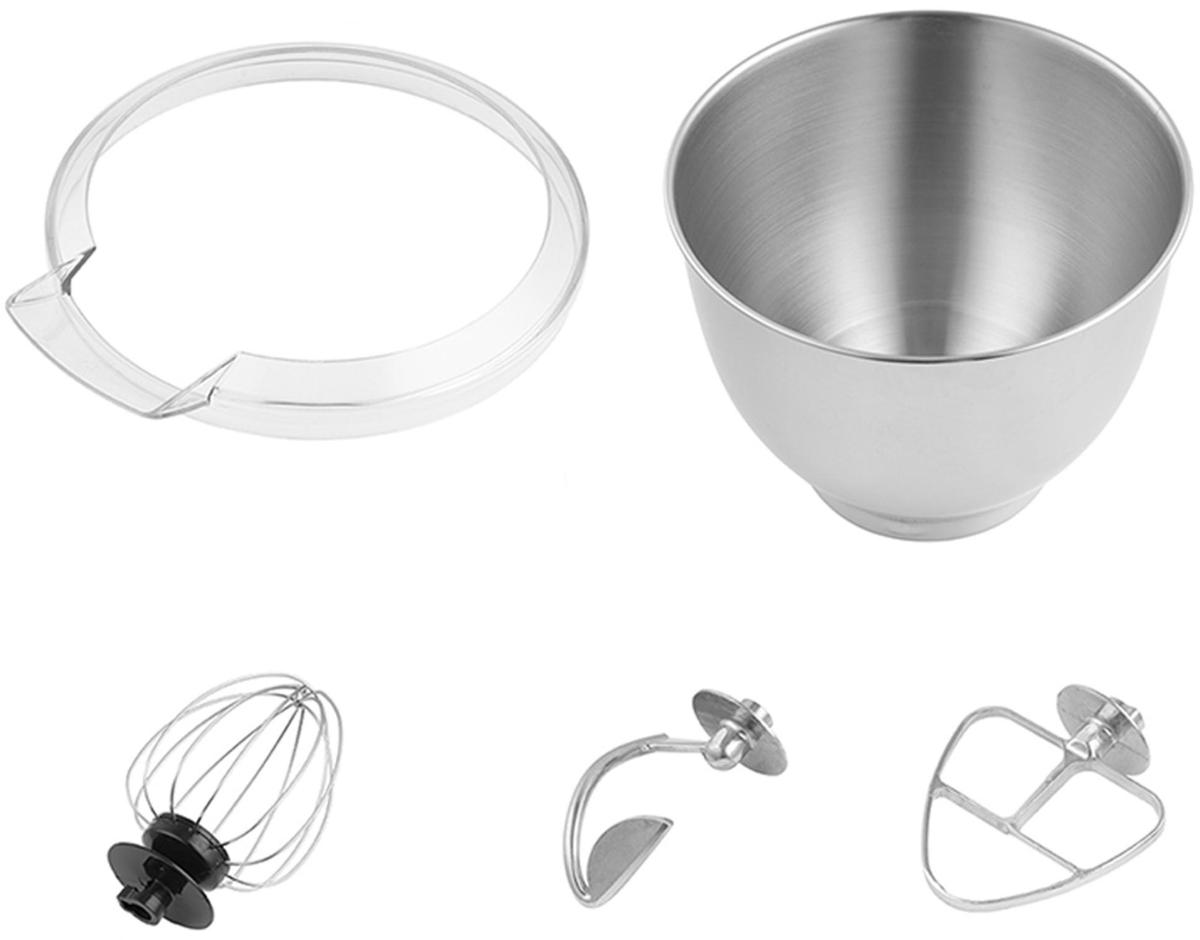 Миксер оснащён вместительной чашей 4 л. Форма насадок и чаши подобраны так, что при любом количестве продуктов насадка не оставляет их по краям не перемешанными.
