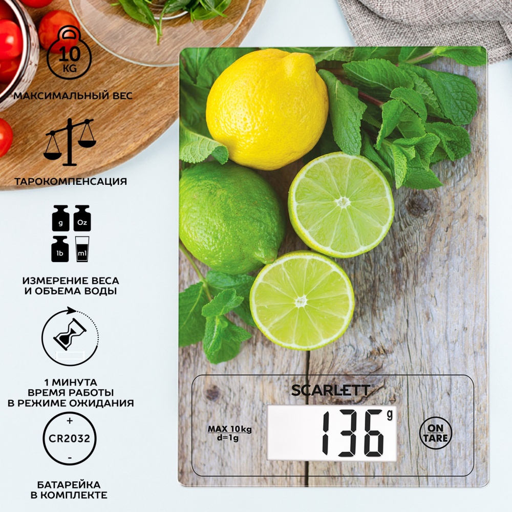 Кухонные весы Scarlett SC-KS57P21 имеют стильный дизайн, занимают мало места на кухне, взвешивают продукты с точностью до 1 грамма. Вы можете измерять вес как в граммах, так и в унциях, фунтах и даже миллилитрах. Платформа весов изготовлена из прочного ударопрочного стекла. Все функции весов управляются при помощи чувствительных сенсорных кнопок, информация выводится на LCD-дисплей. Для работы потребуется всего одна батарейка типа CR2032.