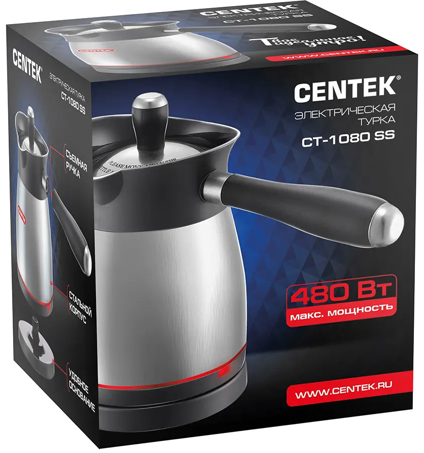 Электрическая турка Centek СТ-1080 – стильное и современное решение на вашей кухне. Фактурный корпус выполнен из высококачественного пластика и нержавеющей стали – не подвергается коррозии, не влияет на вкусовые качества воды и легко очищается от загрязнений.