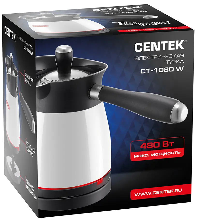 Электрическая турка Centek СТ-1080 – стильное и современное решение на вашей кухне. Фактурный корпус выполнен из высококачественного пластика и нержавеющей стали – не подвергается коррозии, не влияет на вкусовые качества воды и легко очищается от загрязнений.