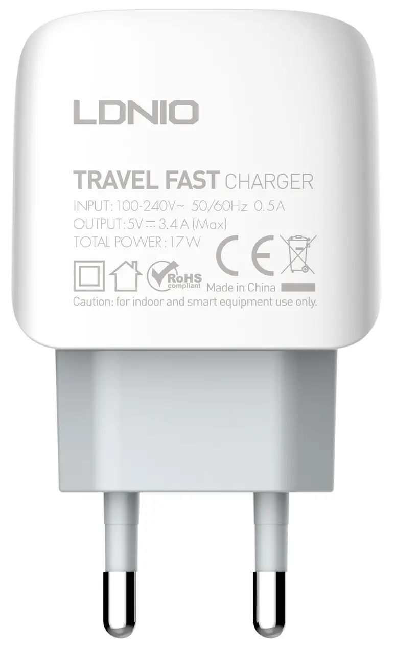 Корпус адаптера изготовлен из высококачественного негорючего пластика (до 850 ⁰C). Важной отличительной чертой продукции Ldnio является то, что в комплекте с зарядным устройством идет кабель длиной 1 м с разъемом Micro USB