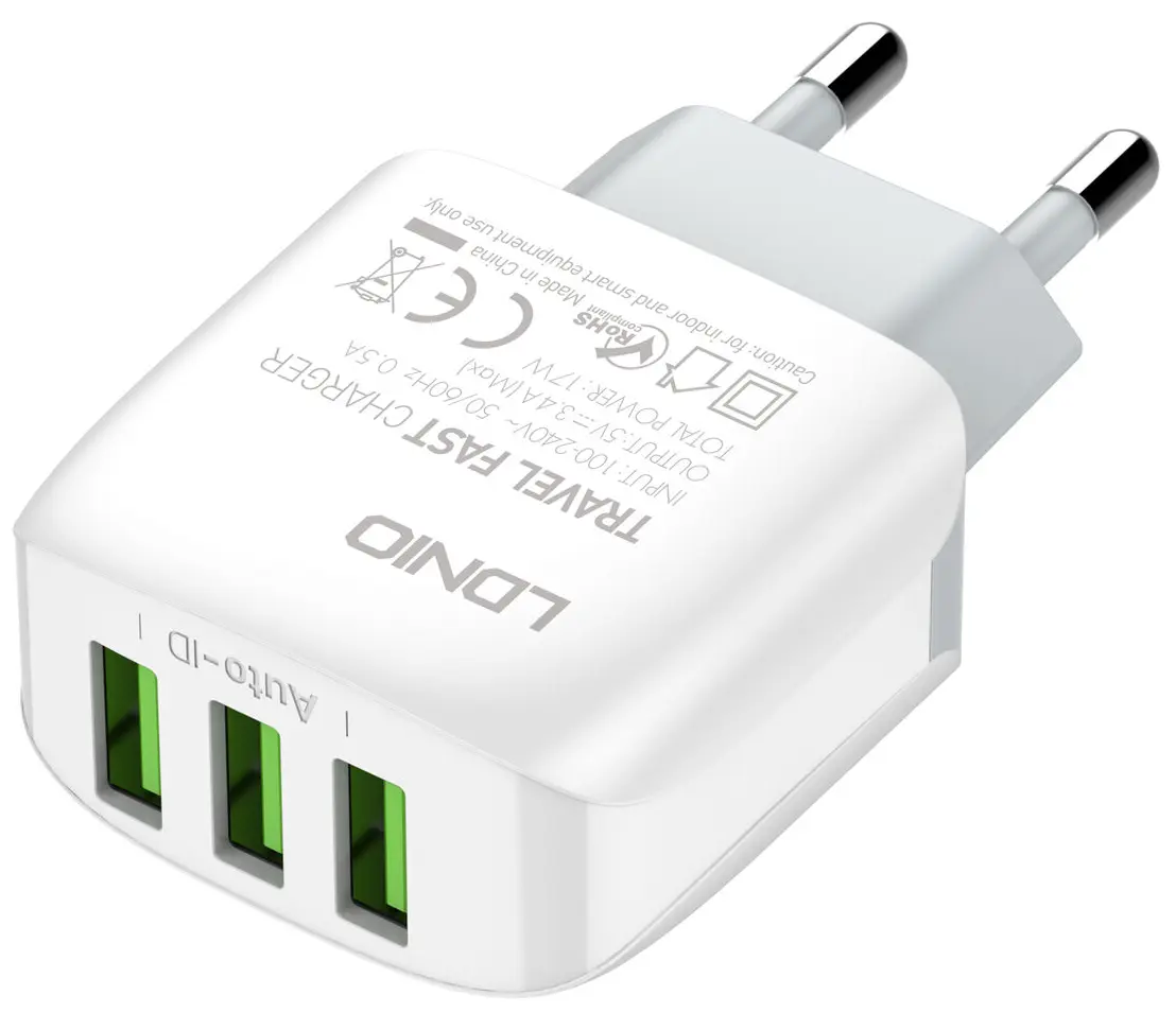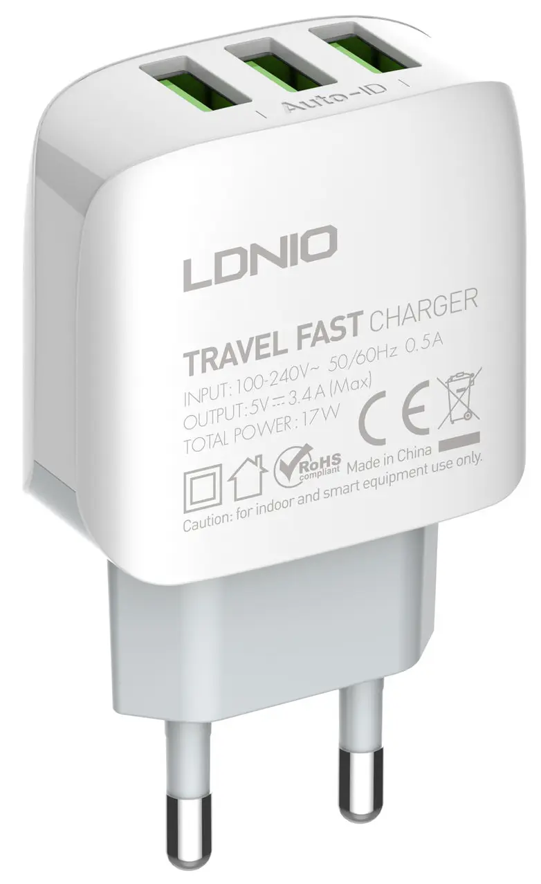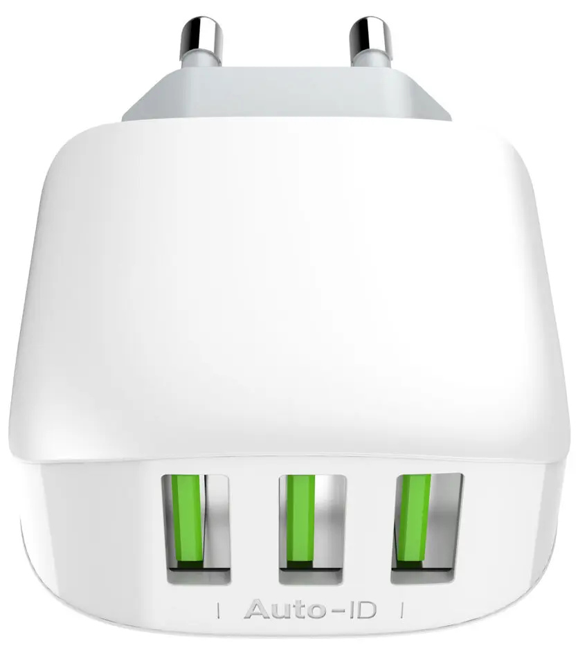 Сетевое зарядное устройство LDNIO A3312 - это стильная и качественная зарядка для мобильных устройств. Устройство оснащено тремя USB выходами TYPE-A, с технологией Auto-ID. Она позволяет автоматически определять подключенное устройство и заряжать его максимальным током - это существенно сокращает время зарядки.