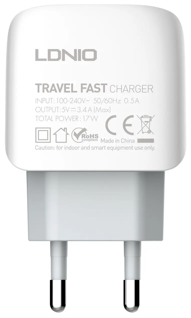 Входное напряжение - от 100 до 240 В. Выходные параметры: 5V/3.4A(MAX) 17W . Максимальная мощность - 17 Вт. LDNIO A3312 имеет многоуровневую защиту: от повышенного тока, от повышенного напряжения, от короткого замыкания, от перегрева.