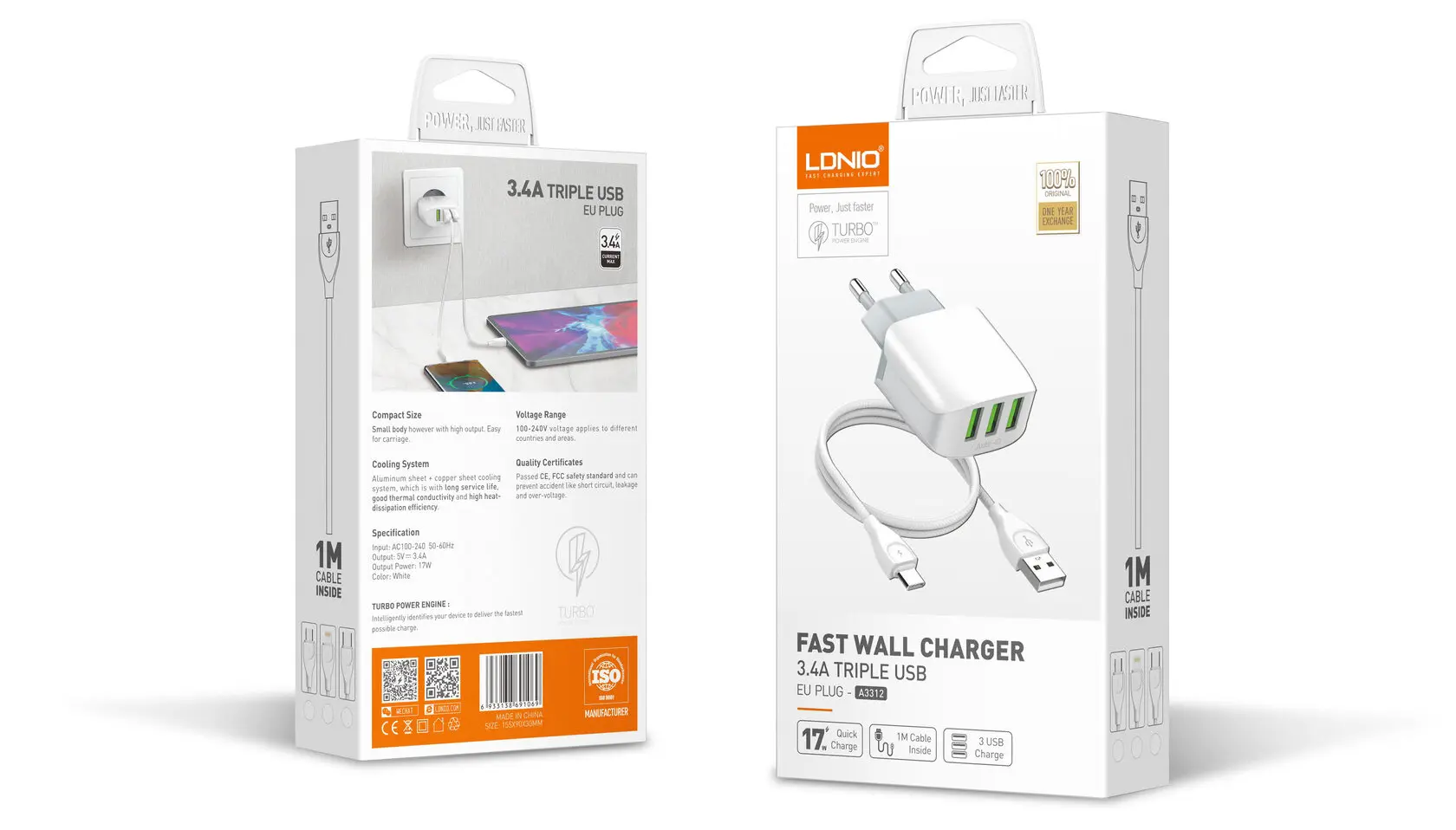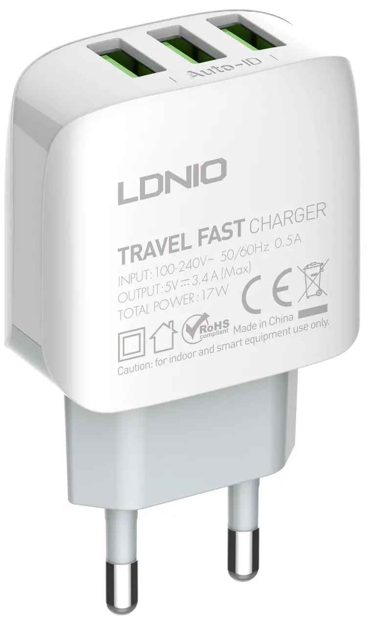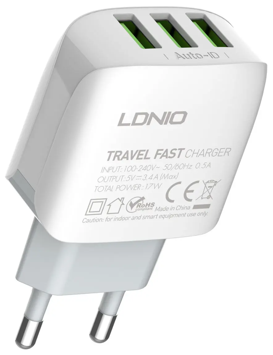 Сетевое зарядное устройство LDNIO A3312 - это стильная и качественная зарядка для мобильных устройств. Устройство оснащено тремя USB выходами TYPE-A, с технологией Auto-ID. Она позволяет автоматически определять подключенное устройство и заряжать его максимальным током - это существенно сокращает время зарядки.