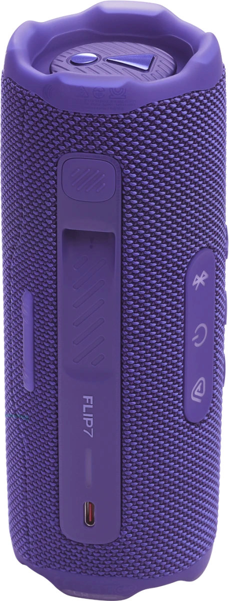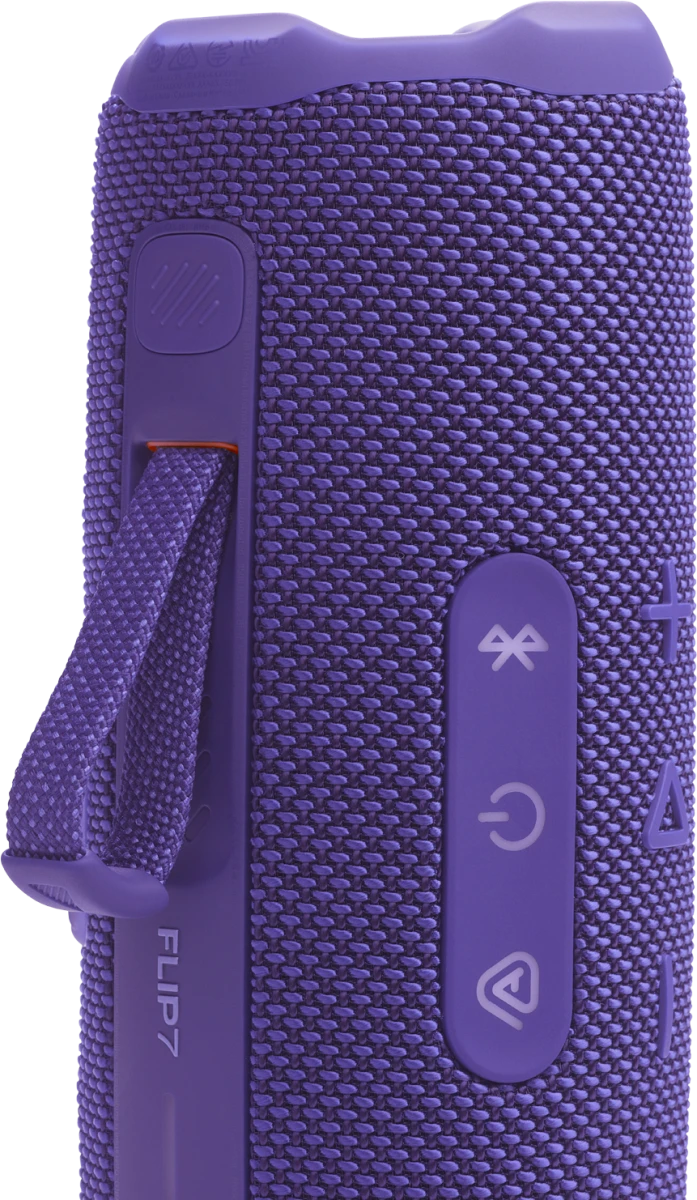 Корпус колонки JBL Flip 7 Purple соответствует степени защиты IP68. Устройство полностью защищено от попадания пыли и может погружаться в воду на глубину до 1 метра на 30 минут. Конструкция устойчива к механическим воздействиям, включая падения.