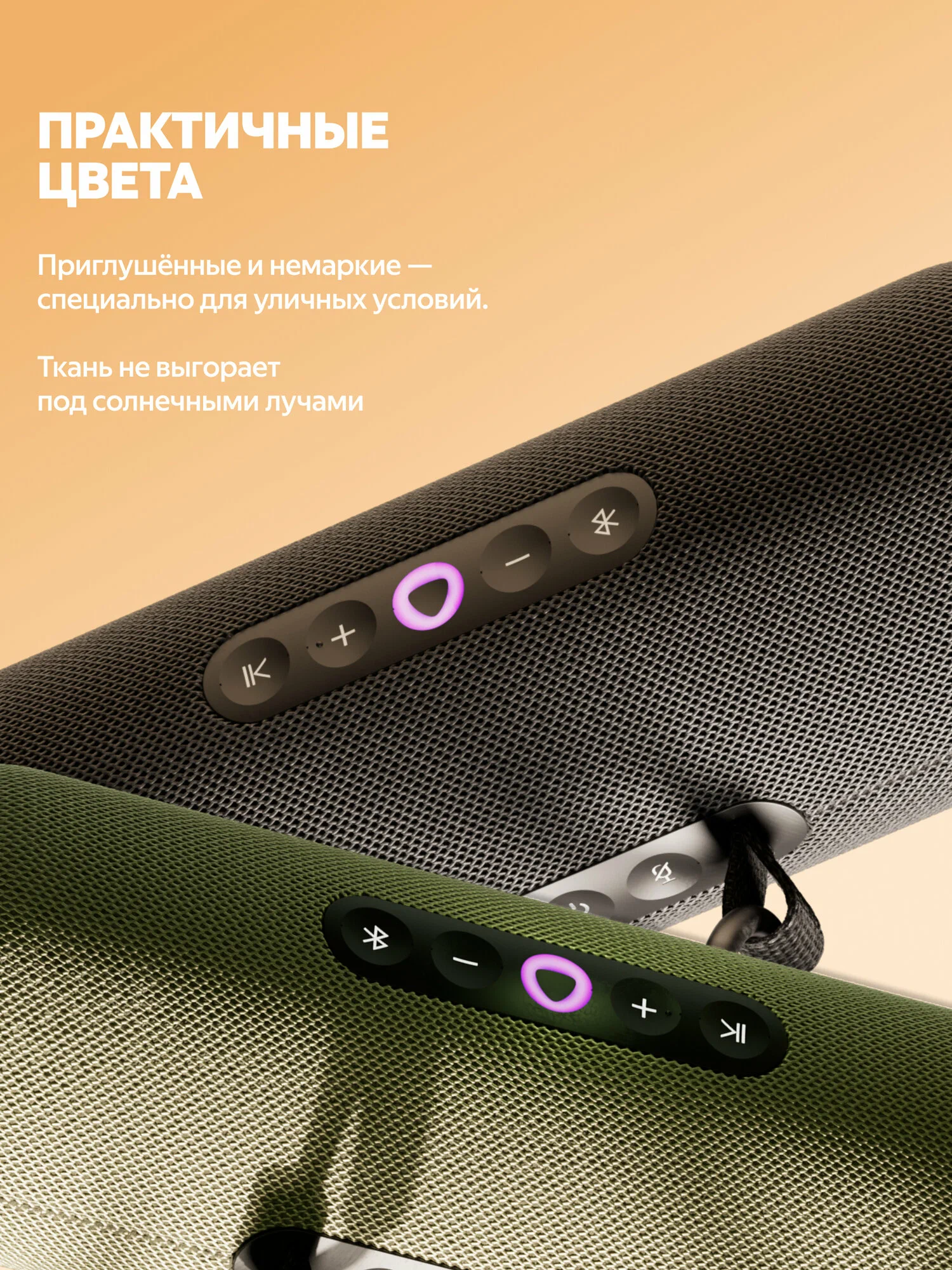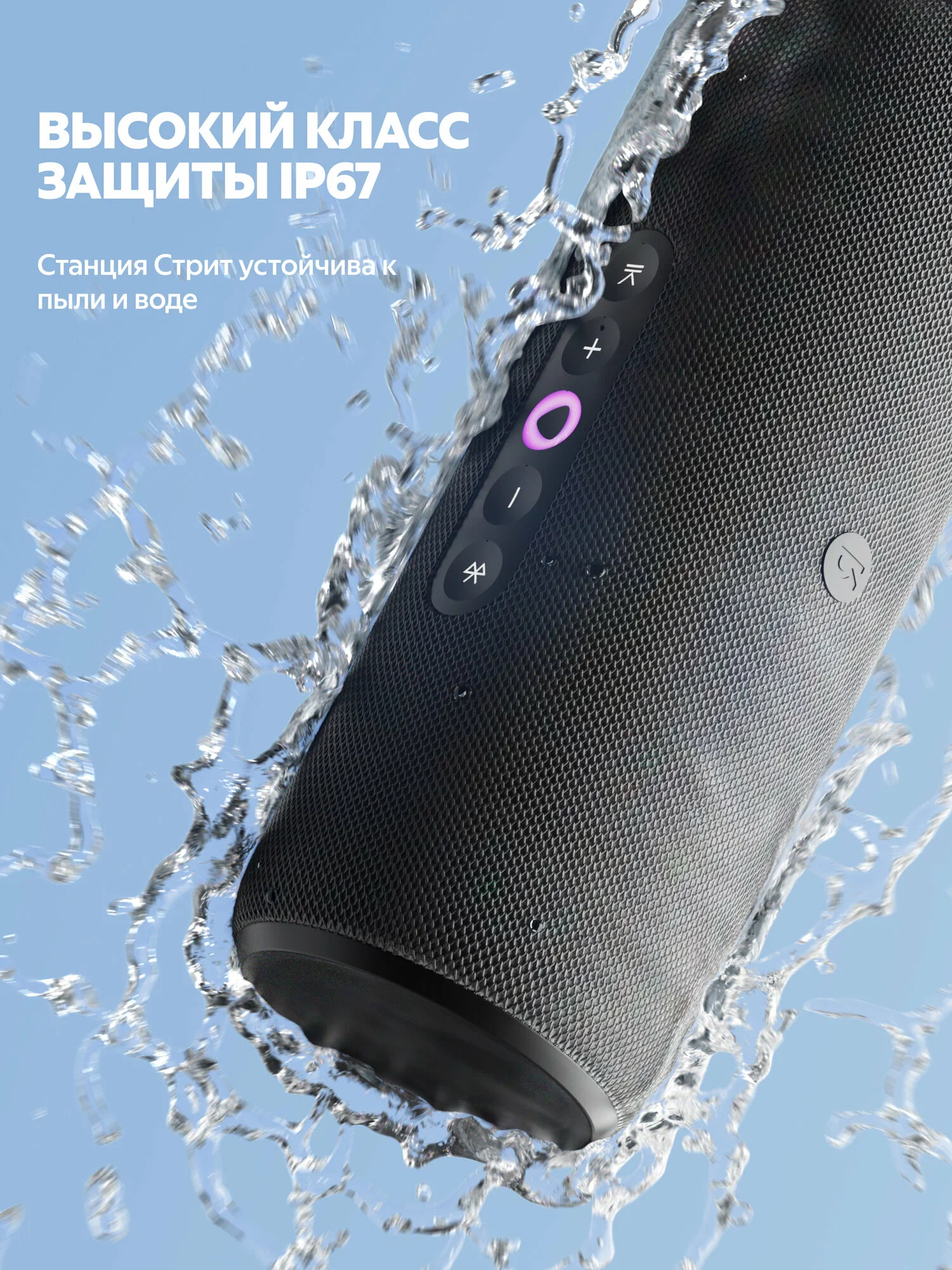 Благодаря высокому классу защиты IP67 Яндекс Станция Стрит устойчива к пыли и воде⁴, а ткань приглушённых цветов не выгорает на солнце. Если в зарядный разъём попадёт вода, Алиса сама напомнит просушить колонку.