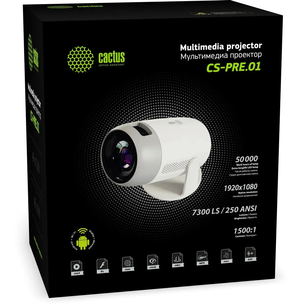 Проектор Cactus CS-PRE.01B.Full HD-A — компактное решение для домашнего кино. Поддерживает разрешение Full HD (1920x1080), яркость 250 лм, контрастность 1500:1, интерфейсы HDMI, miniJack, встроенные динамики. Проектор идеален для фильмов и игр.