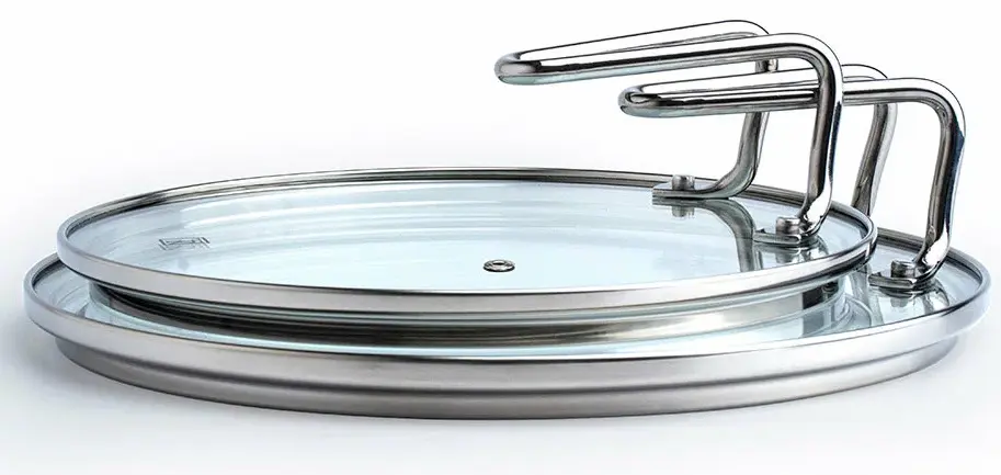Крышка из жаропрочного стекла со стальным ободом с отверстием для выхода пара. Плоская стеклянная крышка. Оригинальная форма ручки позволяет поставить крышку на ребро